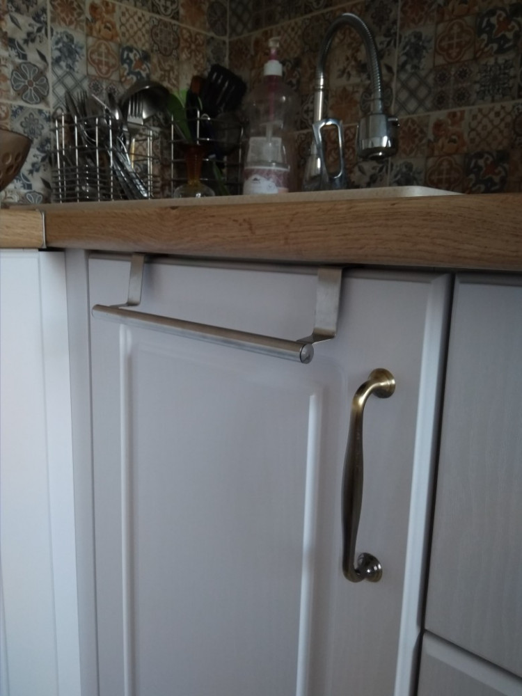 Небольшой полотенце держатель, понравился. Прилагаю описание с размером, желательно толщина дверей шкафов не должна быть меньше или больше 2,5см.