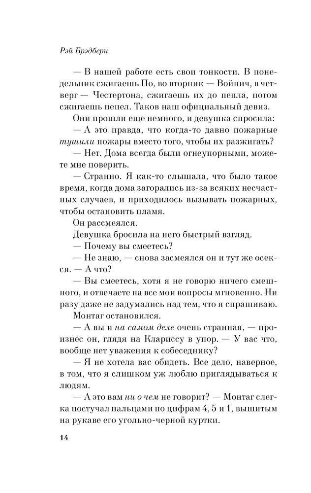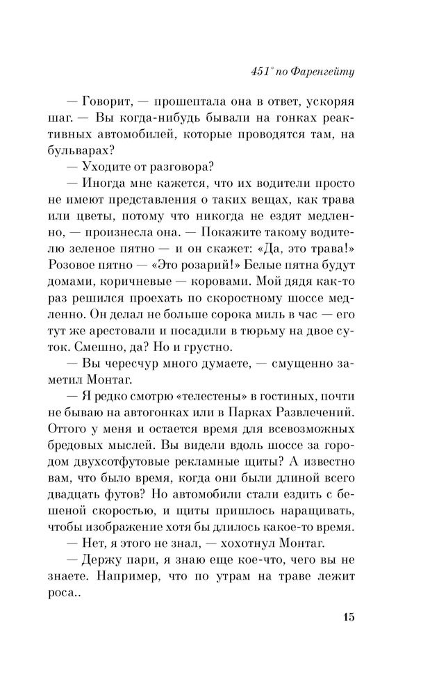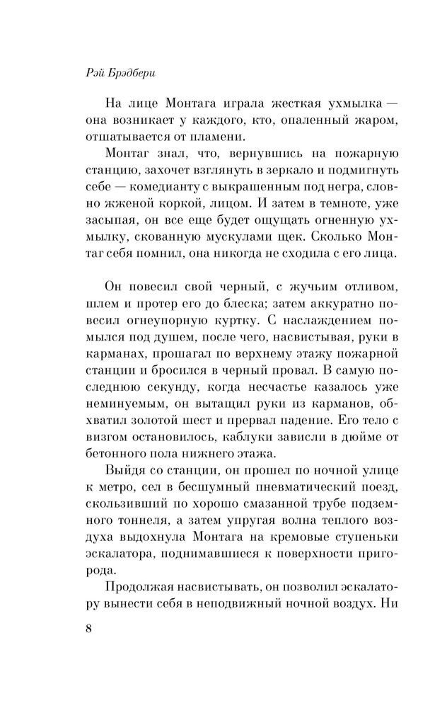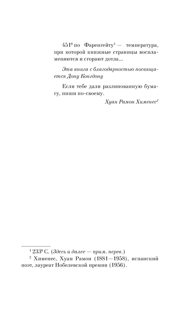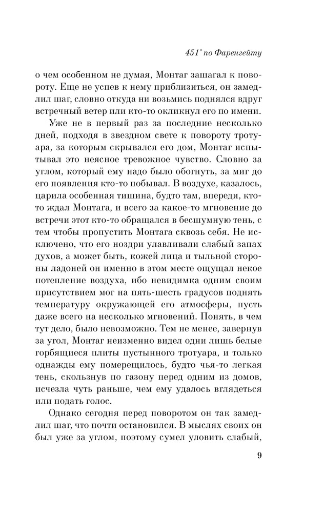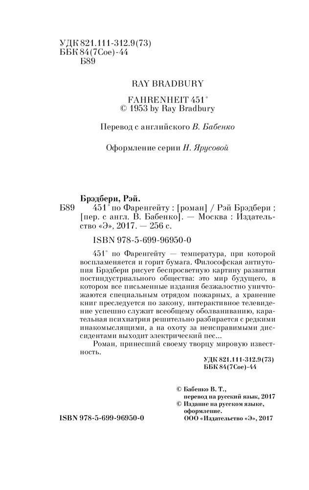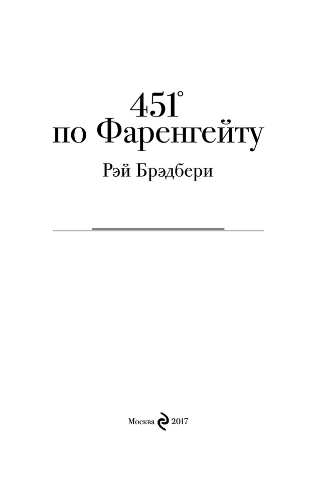451° по Фаренгейту — температура, при которой воспламеняется и горит бумага. Философская антиутопия Брэдбери рисует беспросветную картину развития постиндустриального общества: это мир будущего, в котором все письменные издания безжалостно уничтожаются специальным отрядом пожарных, а хранение книг преследуется по закону, интерактивное телевидение успешно служит всеобщему оболваниванию, карательная психиатрия решительно разбирается с редкими инакомыслящими, а на охоту за неисправимыми диссидентами выходит электрический пес... Роман, принесший своему творцу мировую известность.