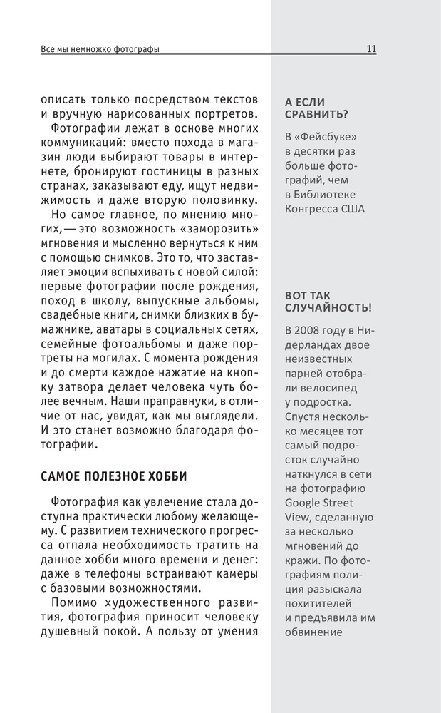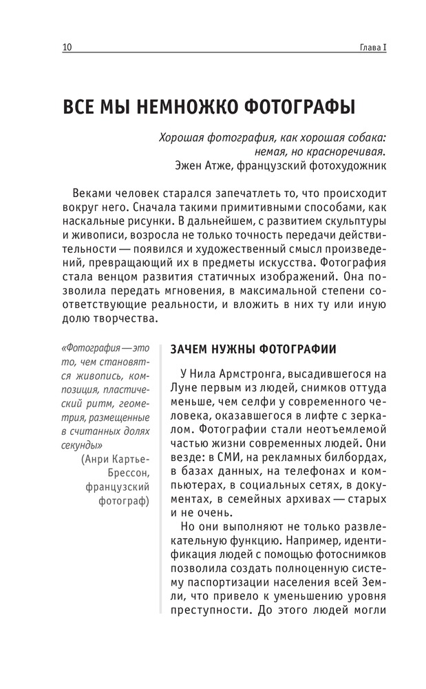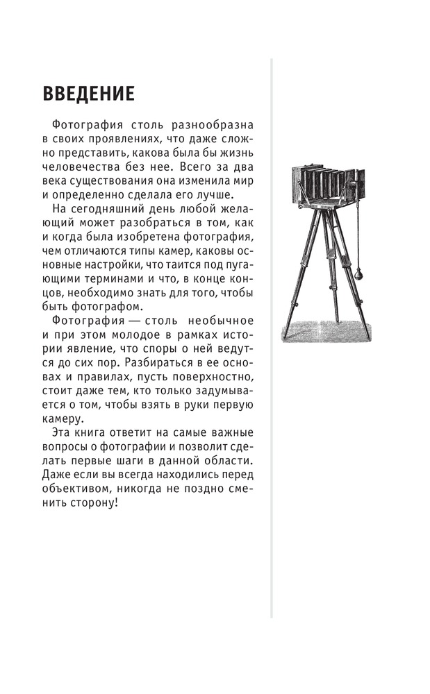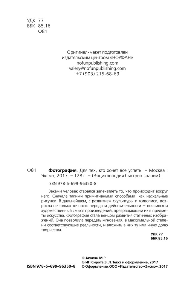 Фотография. Для тех, кто хочет все успетьВ данный момент этот товар отсутствует в продаже. Возможно, у нас найдется аналогичный или похожий товар здесь. Серия: Энциклопедия быстрых знаний Веками человек старался запечатлеть то, что происходит вокруг него. Сначала такими примитивными способами, как наскальные рисунки. В дальнейшем, с развитием скульптуры и живописи, возросла не только точность передачи действительности — появился и художественный смысл произведений, превращающий их в предметы искусства. Фотография стала венцом развития статичных изображений. Она позволила передать мгновения, в максимальной степени соответствующие реальности, и вложить в них ту или иную долю творчества. История возникновения фотографии, эволюция техники, особенности пленки и «цифры», выбор объектива, свет и цвет, экспозиция и композиция: об этом и много другом в нашем содержательном справочнике для тех, кто хочет все успеть. |