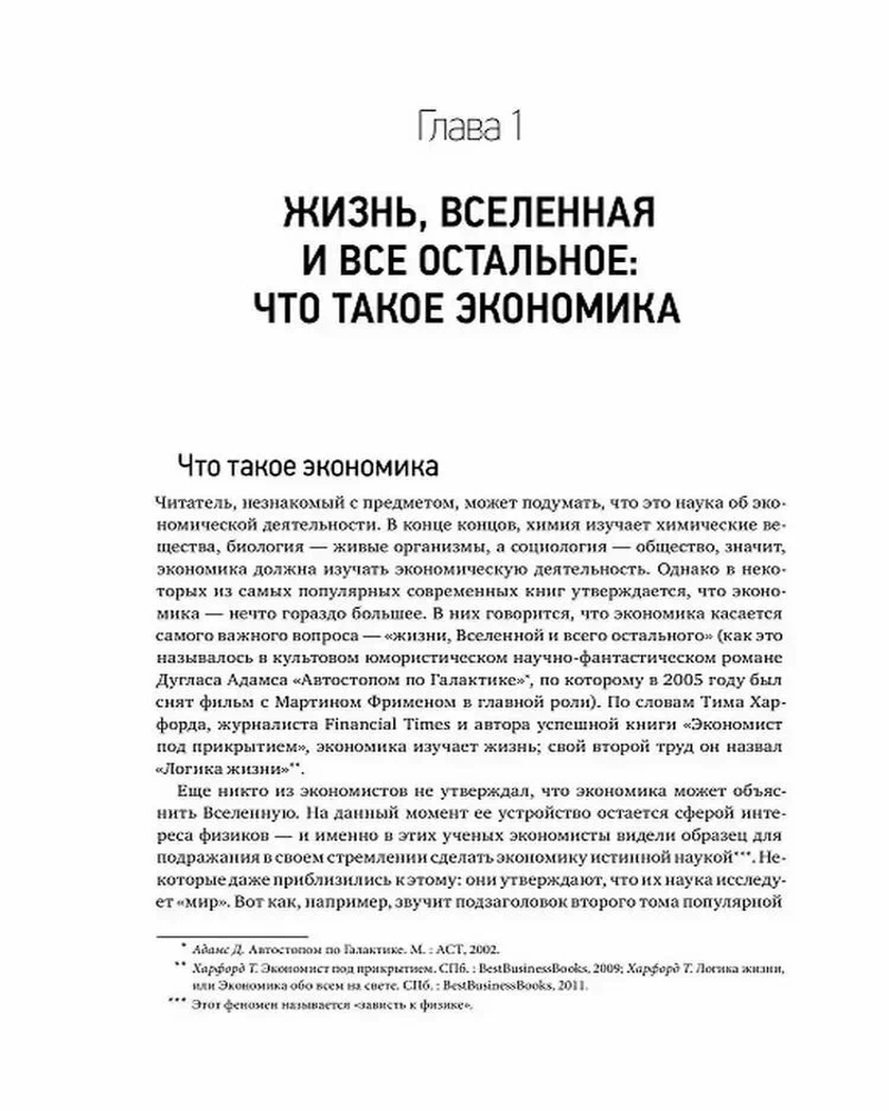 Книга рассказывает о том, что такое экономика в целом, о точках зрения на нее, а также об отдельных ее частях (ВВП, безработице, международной торговле, бедности, бирже и т.д.) и ее истории. Слог хороший, в общем все понятно написано, но была парочка моментов, которые я не особо хорошо понял. Насколько точен перевод, я не могу сказать, так как с оригиналом не сравнивал, возможно, это из-за перевода мне было тяжело понять некоторые вещи, но русский текст хорош тем, что, читая, ты не замечаешь, что это перевод, практически все слова и выражения звучат естественно, без «машинного» тона. Я, как человек, почти ничего не смыслящий в экономике, почерпнул много полезного из этой книги. Экономистом после ее прочтения не стать, но она предлагает базовые знания, с упором на которые можно затем углубиться в какую-нибудь отдельную тему. Рекомендую.