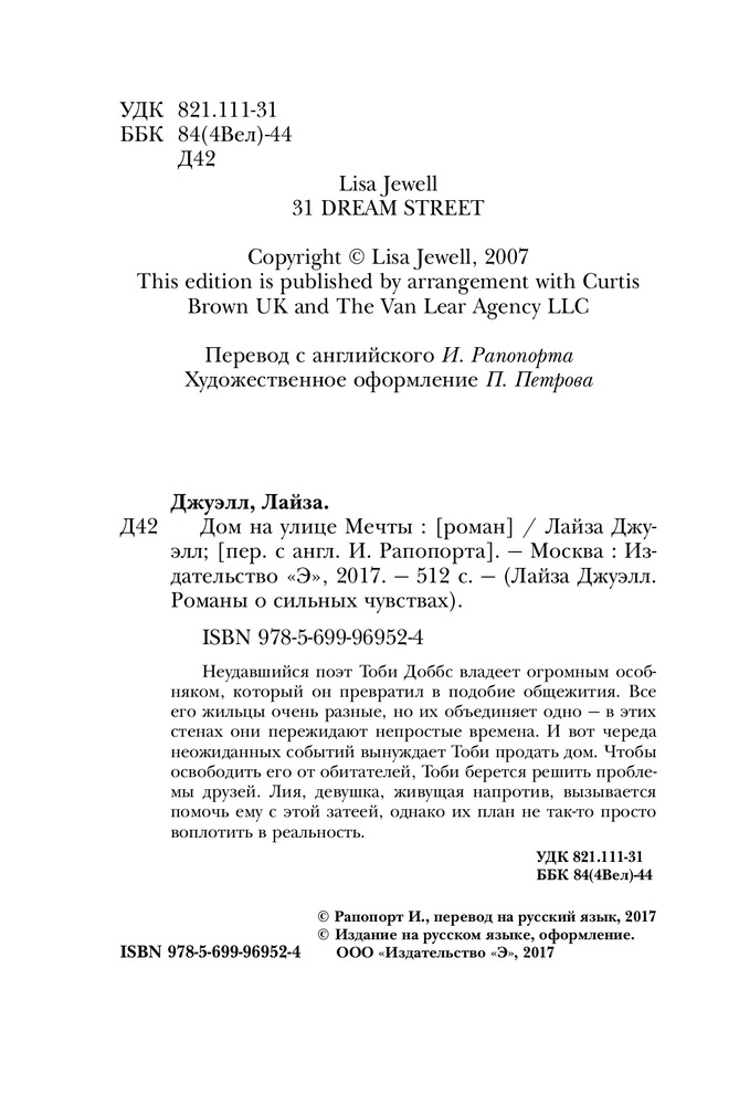 Дом на улице МечтыВ данный момент этот товар отсутствует в продаже. Возможно, у нас найдется аналогичный или похожий товар здесь. Неудавшийся поэт Тоби Доббс владеет огромным особняком, который он превратил в подобие общежития. Все его жильцы очень разные, но их объединяет одно — в этих стенах они пережидают непростые времена. И вот череда неожиданных событий вынуждает Тоби продать дом. Чтобы освободить его от обитателей, Тоби берется решить проблемы друзей. Лия, девушка, живущая напротив, вызывается помочь ему с этой затеей, однако их план не так-то просто воплотить в реальность. |