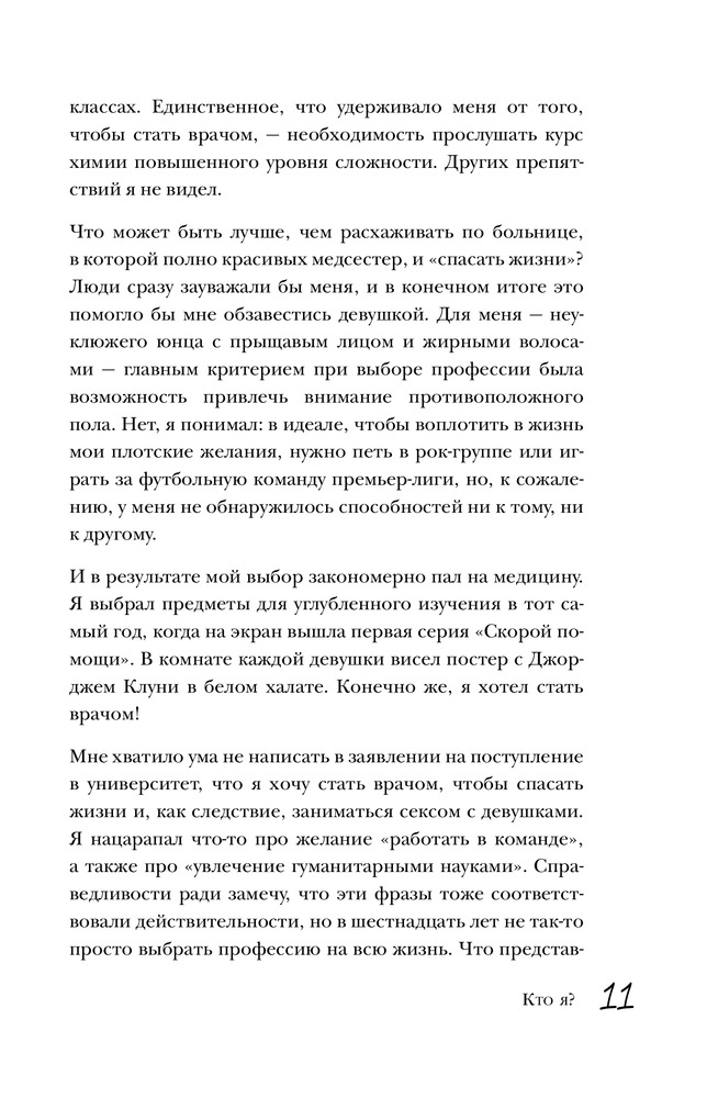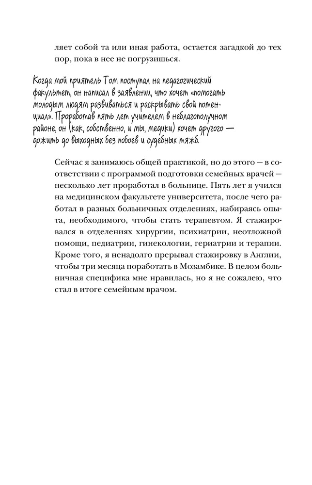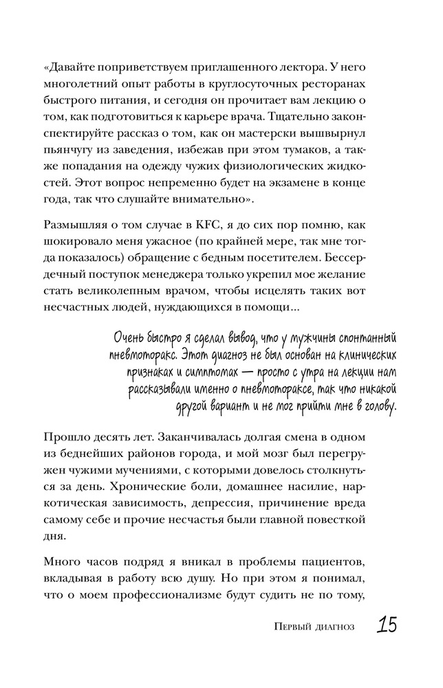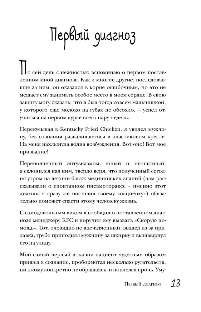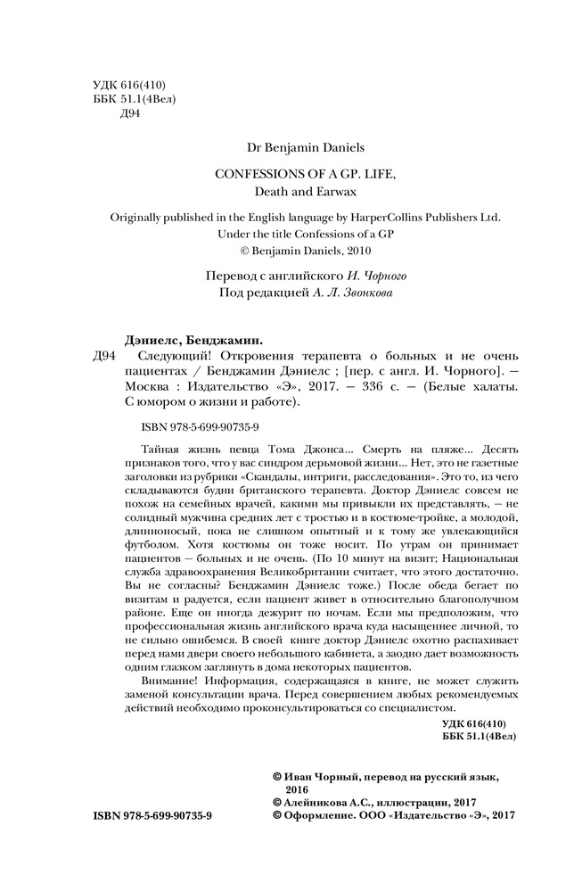 Следующий! Откровения терапевта о больных и не очень пациентахВ данный момент этот товар отсутствует в продаже. Возможно, у нас найдется аналогичный или похожий товар здесь. Серия: Белые халаты. С юмором о жизни и работе Тайная жизнь певца Тома Джонса... Смерть на пляже... Десять признаков того, что у вас синдром дерьмовой жизни... Нет, это не газетные заголовки из рубрики «Скандалы, интриги, расследования». Это то, из чего складываются будни британского терапевта. Доктор Дэниелс совсем не похож на семейных врачей, какими мы привыкли их представлять, — не солидный мужчина средних лет с тростью и в костюме-тройке, а молодой, длинноносый, пока не слишком опытный и к тому же увлекающийся футболом. Хотя костюмы он тоже носит. По утрам он принимает пациентов — больных и не очень. (По 10 минут на визит; Национальная служба здравоохранения Великобритании считает, что этого достаточно. Вы не согласны? Бенджамин Дэниелс тоже.) После обеда бегает по визитам и радуется, если пациент живет в относительно благополучном районе. Еще он иногда дежурит по ночам. Если мы предположим, что профессиональная жизнь английского врача куда насыщеннее личной, то не сильно ошибемся. В своей книге доктор Дэниелс охотно распахивает перед нами двери своего небольшого кабинета, а заодно дает возможность одним глазком заглянуть в дома некоторых пациентов. |