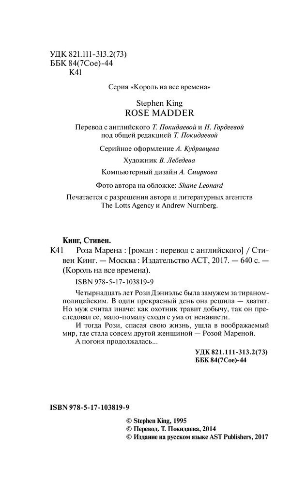 Эта книга про меня!!! Муж издевался надо мной 9 лет, а героиня романа терпела 14. Я бы тоже отомстила так же как Роза. Жаль что это только в книжках. Но рада что прочла этот роман и почувствовала вкус расплаты. Восхищаюсь Кингом!