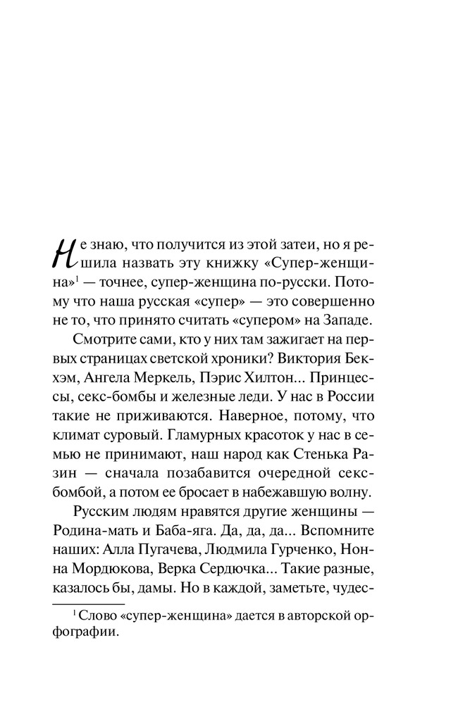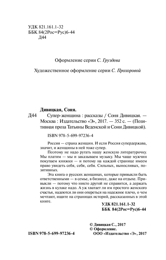 В данный момент этот товар отсутствует в продаже. Возможно, у нас найдется аналогичный или похожий товар здесь. Серия: Позитивная проза Татьяны Веденской (обложка) Россия — страна женщин. И если Россия супердержава, значит, и женщины в ней тоже супер.
