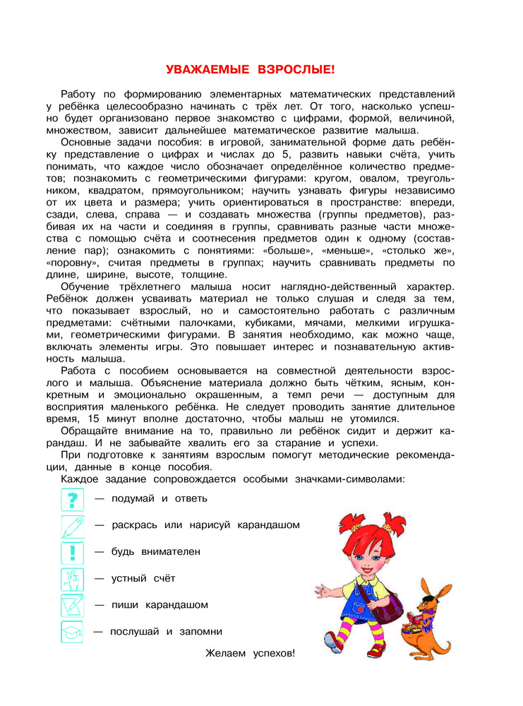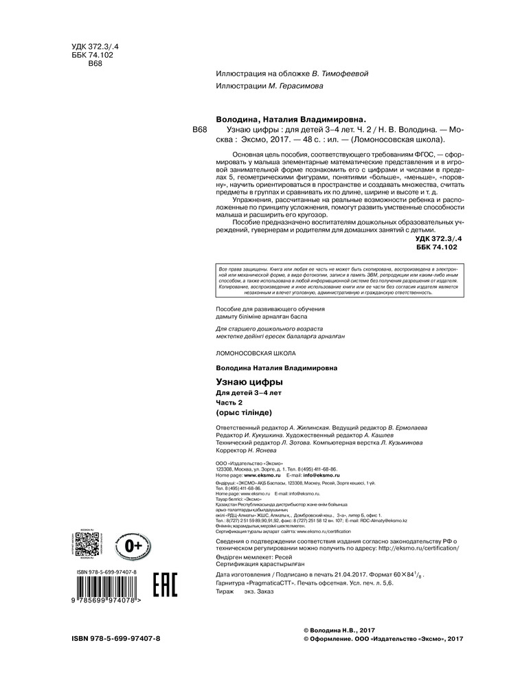 💳 Оплатить за товар можно при получении 🇰🇿 Есть бесплатная доставка по Казахстану 🎁 Копите бонусы с каждой покупки Серия: Ломоносовская школа Основная цель пособия, соответствующего требованиям ФГОС, — сформировать у малыша элементарные математические представления и в игровой занимательной форме познакомить его с цифрами и числами в пределах 5, геометрическими фигурами, понятиями «больше», «меньше», «поровну», научить ориентироваться в пространстве и создавать множества, считать предметы в группах и сравнивать их по длине, ширине и высоте и т. д. |
