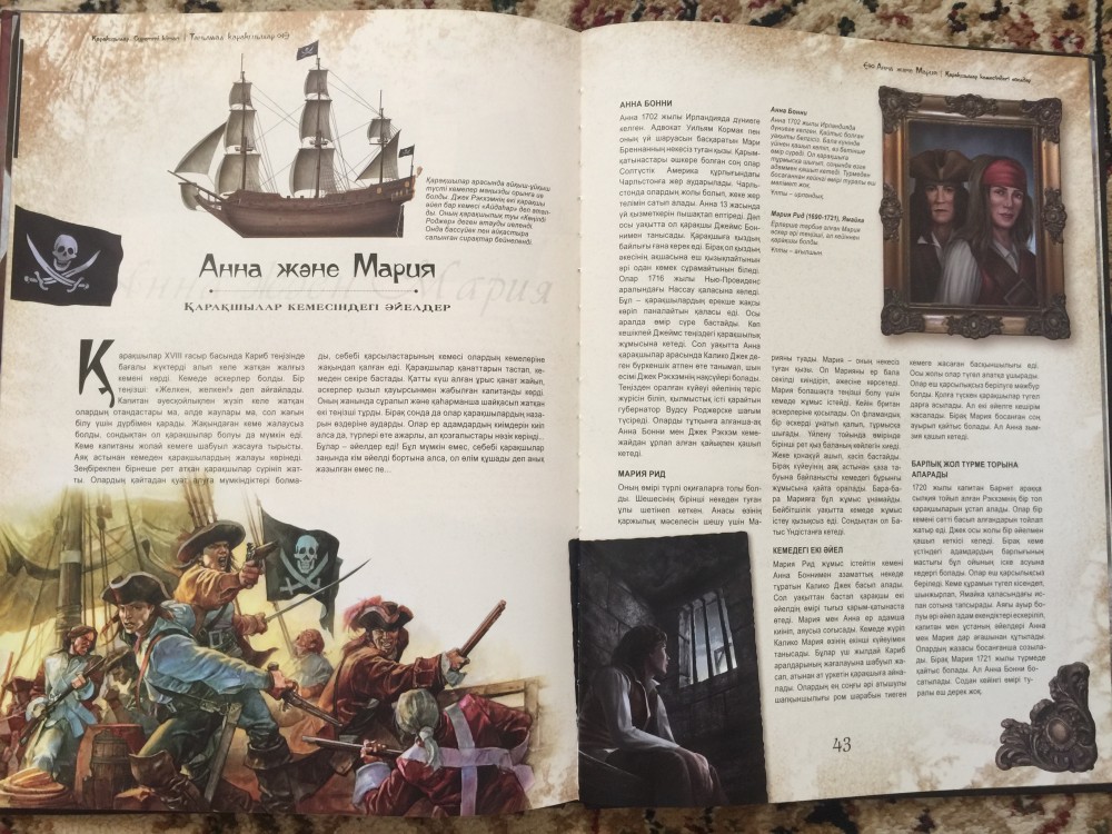 Түрлі түсті суреттерден құралған қарақшылық жайындағы көркем суретті кітап. Кітаптың мазмұнында қарақшылықтың басталуы, гүлдену тарихы баяндалған. Кариб және Жерорта теңіздері қарақшыларының өмірі, қызметтері сипатталып жазылған. Сонымен Вокоу-жапон және қытай қарақшыларының өмір тіршіліктері де көрсетілген. Атақты Каперлар мен флибустьерлер туралы қызықты мәліметтер берілген. Кітап барша кітап окырмандарының назарынан шығады деген үміттеміз. |