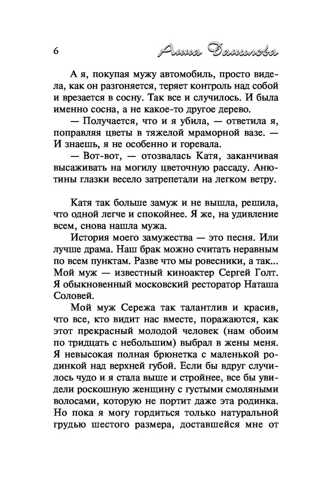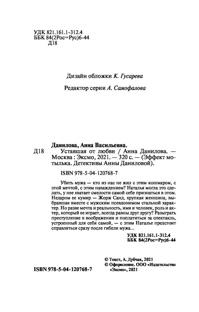 💳 Оплатить за товар можно при получении 🇰🇿 Есть бесплатная доставка по Казахстану 🎁 Копите бонусы с каждой покупки Серия: Эффект мотылька. Детективы Анны Даниловой. Новое оформление (обложка) Убить мужа — кто из нас не жил с этим кошмаром, с этой мечтой, с этим наваждением? Наталья могла это сделать, у нее хватает смелости самой себе признаться в этом. Недаром ее кумир — Жорж Санд, хрупкая женщина, выбравшая вместе с мужским псевдонимом стальной характер. Но разве мечта и реальность, имя и человек, роль и актер, который ее играет, всегда равны друг другу? Разыграть преступление в воображении и поплатиться за спектакль, устроенный для себя самой, — с этим Наталье предстоит справляться сразу после гибели мужа... |