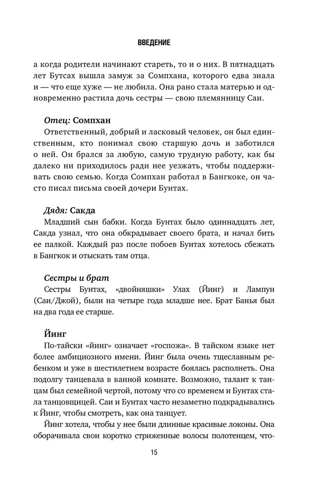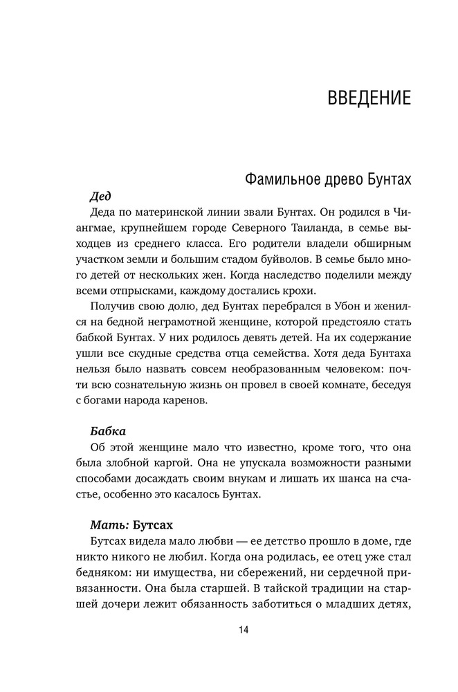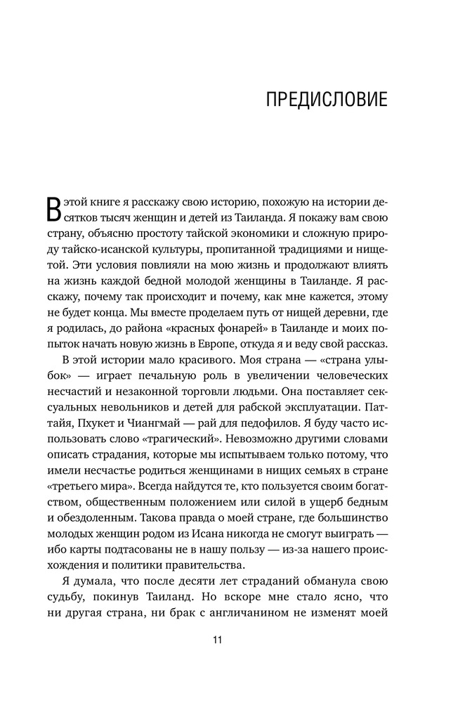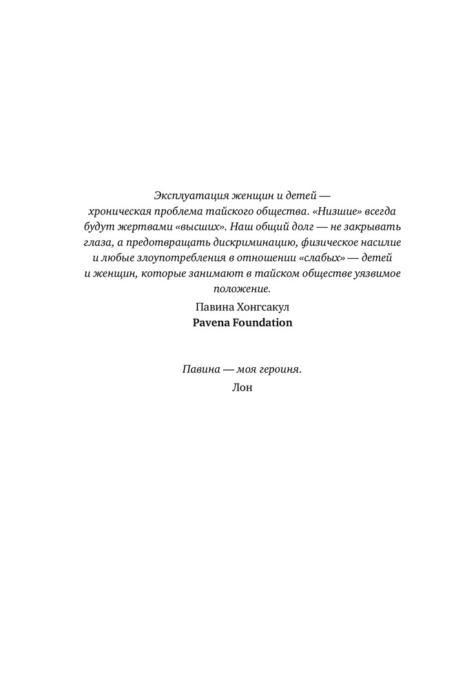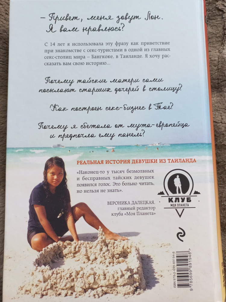 По началу мне было сложно читать, так как воедино смешана грязь, отвращение, боль, обида и искалеченное детство. Данная история показывает другую сторону Тайланда какая она есть на самом деле и как она устроена во всех отношениях, но самое обидное то как это все показано на примере семьи той в которой родился и вырос😥🙈 На самом деле это ужасно!!!И да каким же нужно быть сильным, что б не смотря на то, как унижает и ненавидит тебя семья, пытаться и стараться им помочь в денежном плане! Любой другой человек на месте героя плюнул и отвернулся бы от подобного отношения!!! Но не она, та которая до последнего старалась угодить своей матери которая не ставила её в грош! И каков же результат её жертвы-шизофрения....Эта книга основана на реальных событиях и она должна быть прочитана многими!!!