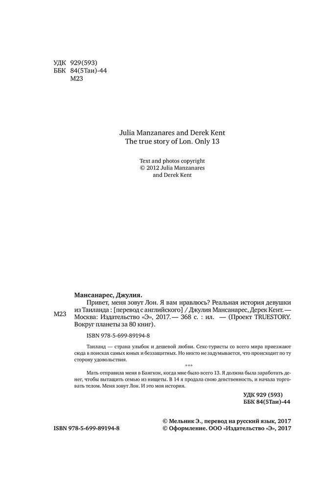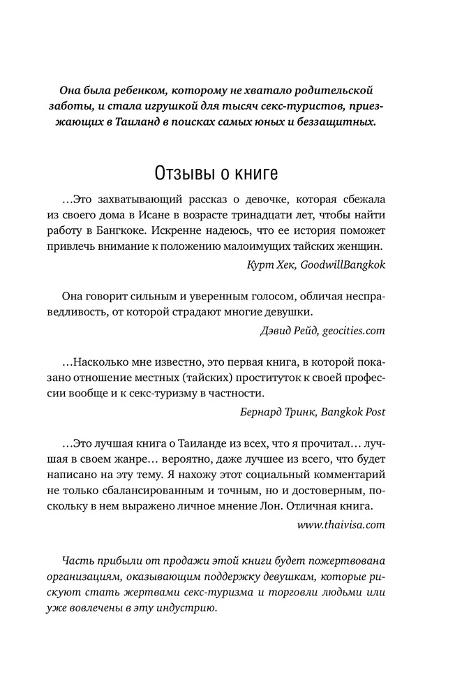 Привет, меня зовут Лон. Я вам нравлюсь? Реальная история девушки из ТаиландаВ данный момент этот товар отсутствует в продаже. Возможно, у нас найдется аналогичный или похожий товар здесь. Серия: Проект TRUESTORY. Вокруг планеты за 80 книг Таиланд — страна улыбок и дешевой любви. Секс-туристы со всего мира приезжают сюда в поисках самых юных и беззащитных. Но никто не задумывается, что происходит по ту сторону удовольствия. |