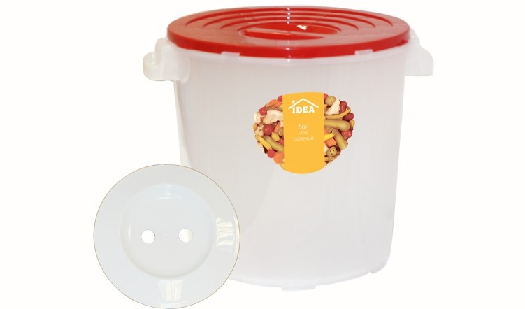 Бак состоит из корпуса, крышки и гнета. Крышку можно закрепить легким поворотным движеним до упора. Гнет имеет форму, которая позволяет ставить на него любой груз, в том числе и банку с водой. |