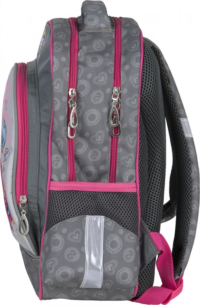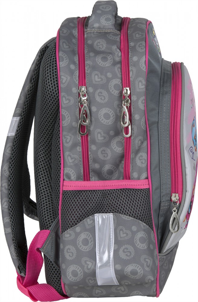 Ортопедический рюкзак имеет легкий вес и компактный размер. Он имеет 2 объемных отделения на молнии, в каждом из которых по одному дополнительному отделению; большой передний карман с внутренним органайзером и карабином для ключей. Два боковых сетчатых кармашка на резинках пригодятся для мелких предметов. Усиленная спинка, созданная по специальной технологии из дышащего плотного и мягкого поролона, равномерно распределяет нагрузку на позвоночник. Мягкие анатомические регулируемые лямки оберегают плечи ребенка от натирания.