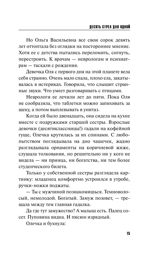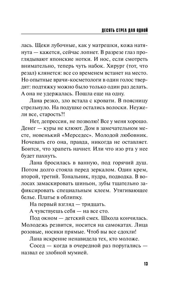 Десять стрел для однойВ данный момент этот товар отсутствует в продаже. Возможно, у нас найдется аналогичный или похожий товар здесь. Серия: Знаменитый тандем Российского детектива (обложка) На скромную библиотекаршу Надю Митрофанову свалилось неожиданное наследство: дом с прекрасным садом в ближайшем Подмосковье. Правда, соседи там довольно неприятные: зловещая слепоглухая ясновидящая, стареющая красотка-психопатка, пьющая куриную кровь, и подозрительный, всюду сующий свой нос пенсионер. А над дачным поселком возвышается темный недостроенный замок, на развалинах которого произошло уже не одно убийство. И с того дня, когда Надя и ее возлюбленный, журналист Дмитрий Полуянов, переступили порог своего дома, с ними начали происходить странные пугающие события, которые совсем не вяжутся с безмятежным дачным отдыхом... |