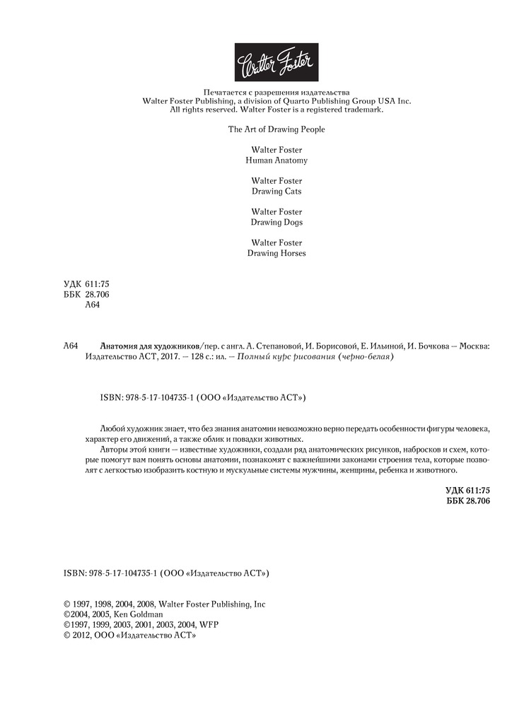 💳 Оплатить за товар можно при получении 🇰🇿 Есть бесплатная доставка по Казахстану 🎁 Копите бонусы с каждой покупки Серия: Полный курс рисования (черно-белая) Прирожденный ли вы художник с особым талантом, профессиональный живописец или начинающий любитель, только осваивающий основы рисования? И в том и в другом случае вы обретете под ногами твердую почву и перестанете быть простым копиистом, если овладеете знаниями по пластической анатомии. Любой художник знает, что без знания анатомии невозможно верно передать особенности фигуры человека, характер его движений, а также облик и повадки животных. Авторы этой книги — известные художники создали ряд анатомических рисунков, набросков и схем, которые помогут вам понять основы анатомии, познакомят с важнейшими законами строения тела, которые позволят с легкостью изобразить костную и мускульные системы мужчины, женщины, ребенка и животного. Овладев этими знаниями даже начинающий художник сможет добиться любой степени реализма. |