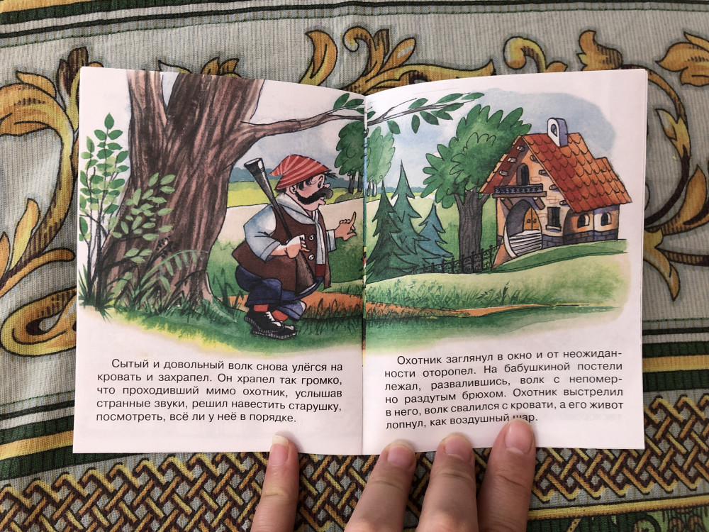 Книжка 10,5см * 14см, маленькая, аккуратная, красочная, большая часть листов занята сказочными рисунками.Д ети слушали и рассматривали книжку с интересом. Таких маленьких книжек у нас не было, но мне понравились.