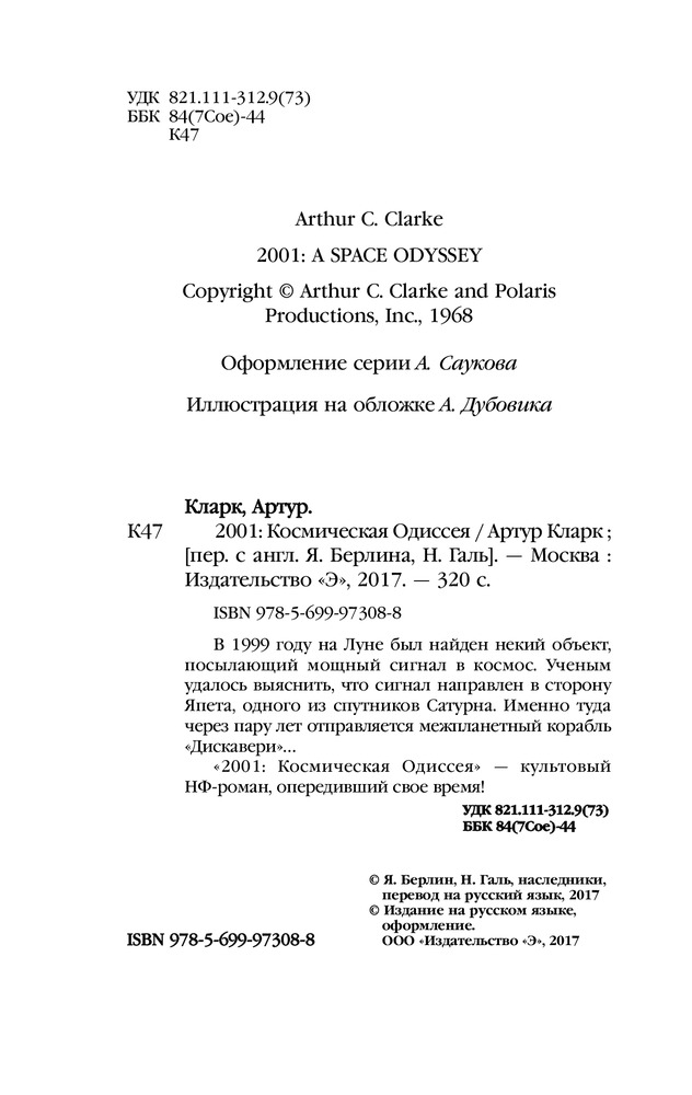 2001: Космическая ОдиссеяВ данный момент этот товар отсутствует в продаже. Возможно, у нас найдется аналогичный или похожий товар здесь. Серия: Лучшая фантастика по лучшей цене (обложка) В 1999 году на Луне был найден некий объект, посылающий мощный сигнал в космос. Ученым удалось выяснить, что сигнал направлен в сторону Япета, одного из спутников Сатурна. Именно туда через пару лет отправляется межпланетный корабль «Дискавери»... «2001: Космическая Одиссея» — культовый НФ-роман, опередивший свое время! |