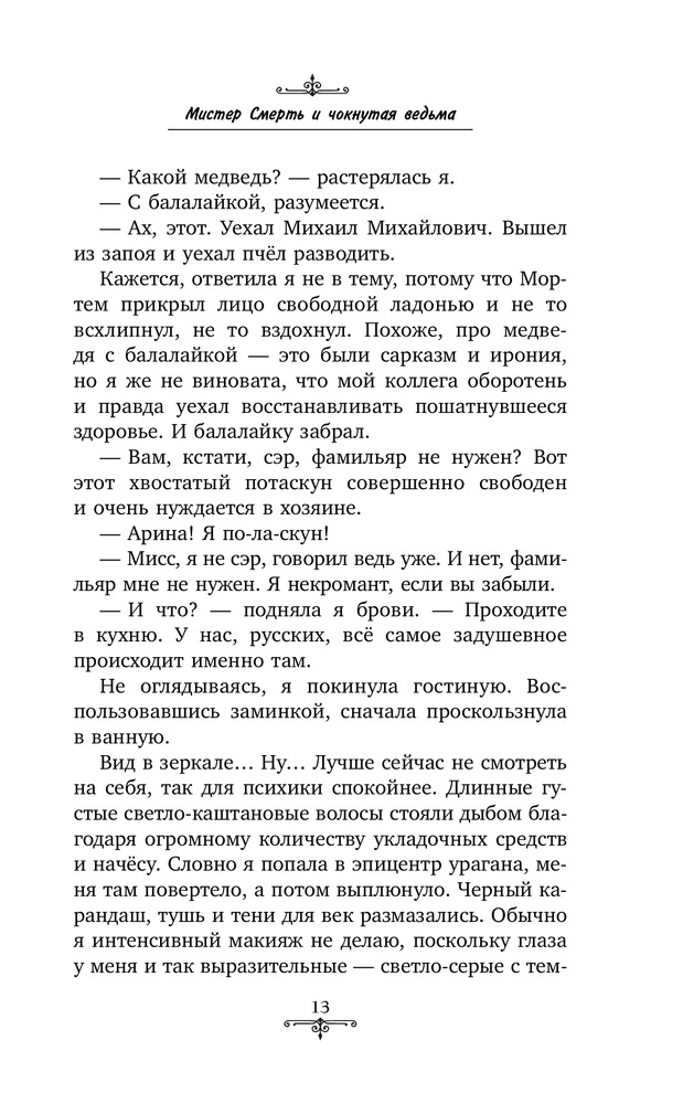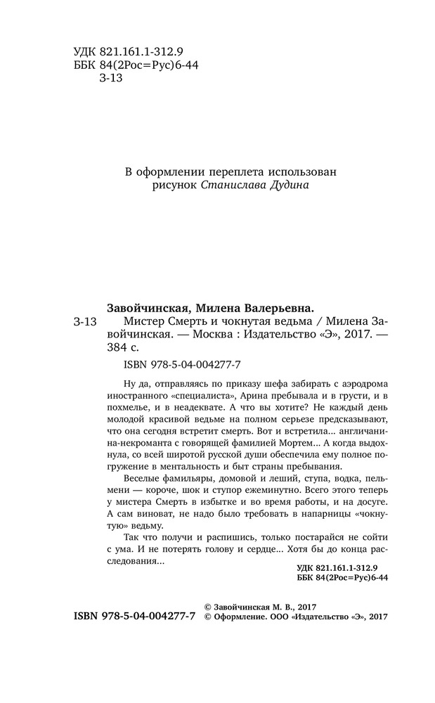 Мистер Смерть и чокнутая ведьмаМилена Валерьевна Завойчинская В данный момент этот товар отсутствует в продаже. Возможно, у нас найдется аналогичный или похожий товар здесь. Серия: Клуб веселых чародеек Ну да, отправляясь по приказу шефа забирать с аэродрома иностранного «специалиста», Арина пребывала и в грусти, и в похмелье, и в неадеквате. А что вы хотите? Не каждый день молодой красивой ведьме на полном серьезе предсказывают, что она сегодня встретит смерть. Вот и встретила... англичанина-некроманта с говорящей фамилией Мортем... А когда выдохнула, со всей широтой русской души обеспечила ему полное погружение в ментальность и быт страны пребывания.Веселые фамильяры, домовой и леший, ступа, водка, пельмени — короче, шок и ступор ежеминутно. Всего этого теперь у мистера Смерть в избытке и во время работы, и на досуге. А сам виноват, не надо было требовать в напарницы «чокнутую» ведьму.Так что получи и распишись, только постарайся не сойти с ума. И не потерять голову и сердце... Хотя бы до конца расследования... |