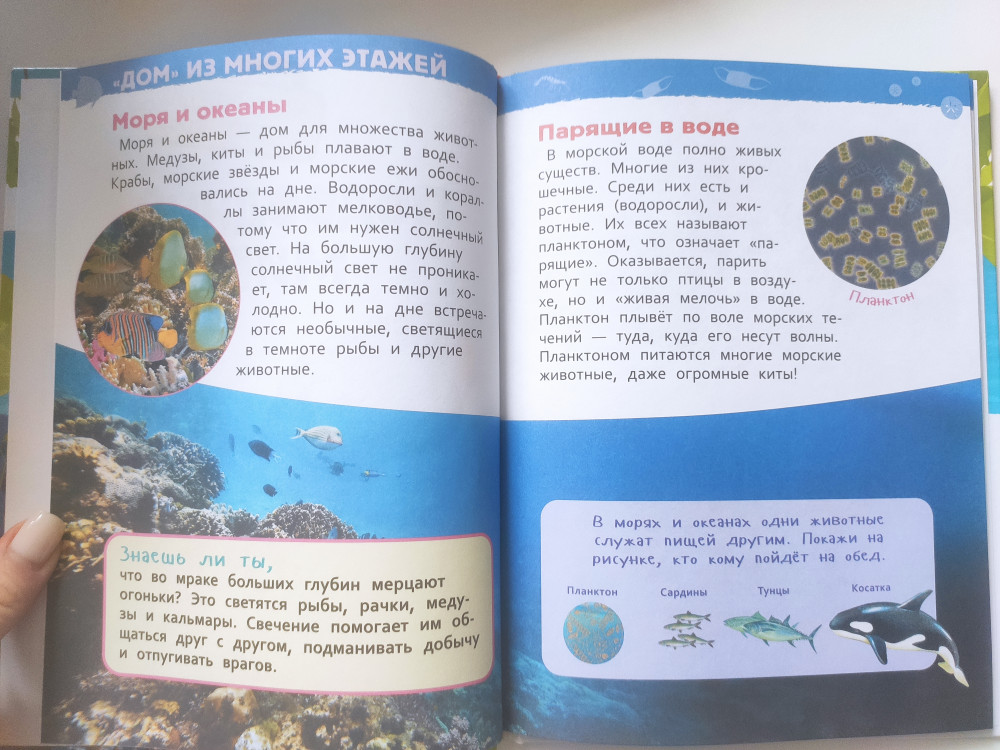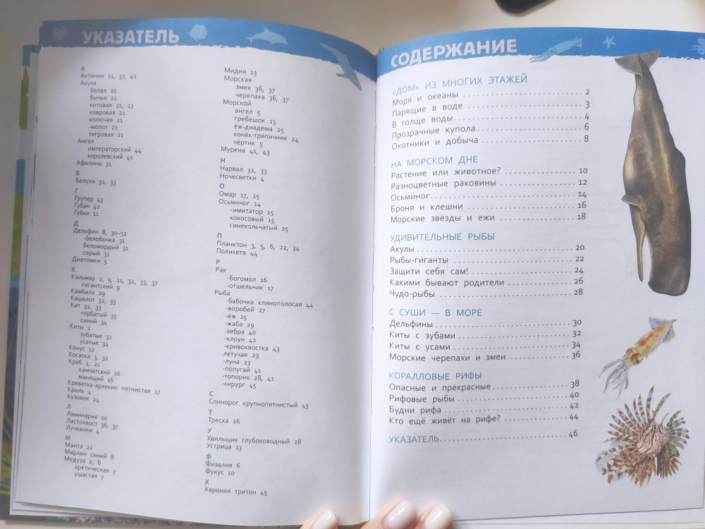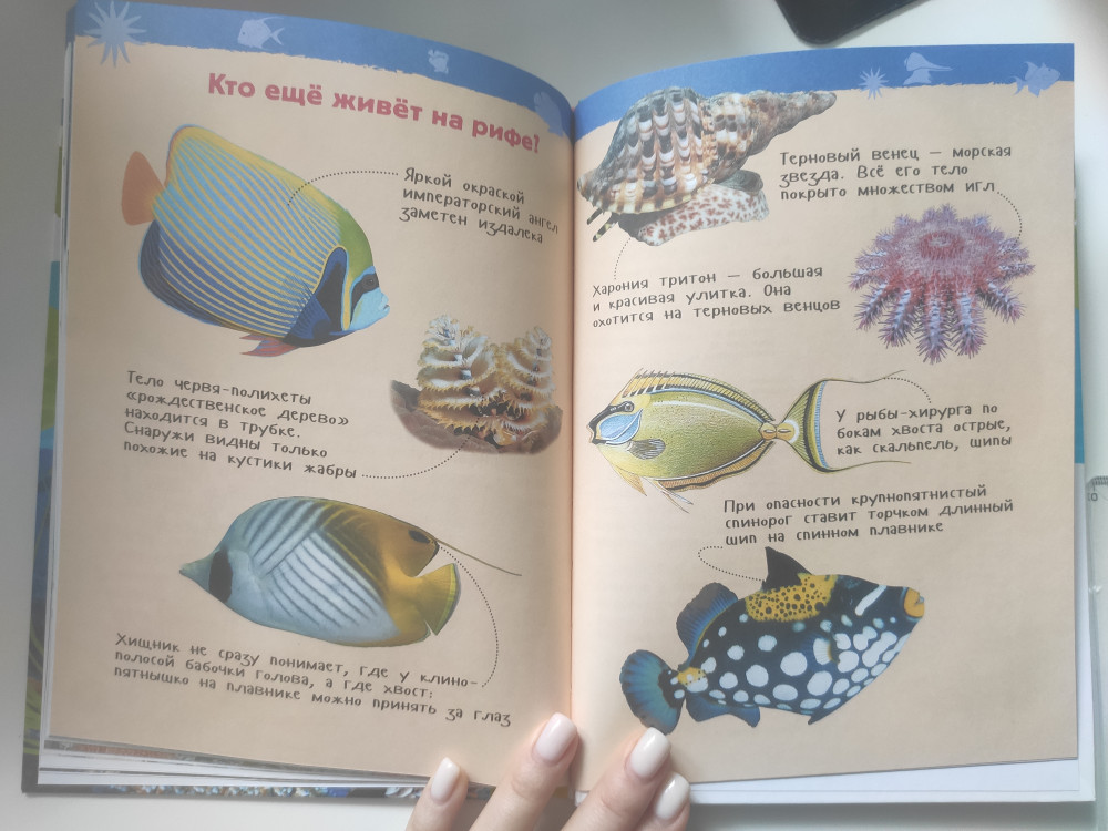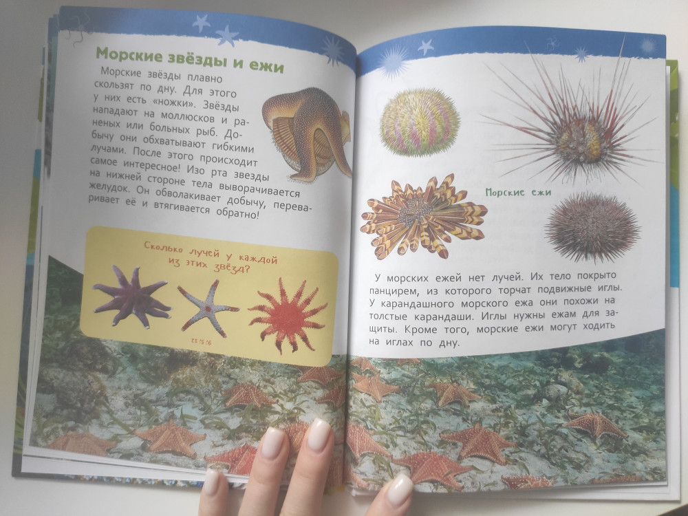 Шикарная книга. Два месяца назад покупали, до сих пор каждый день читаем, рисуем этих морских обитателей. Сыну очень нравится. Компактная в садик, гости, прогулка куда угодно собой таскает.
