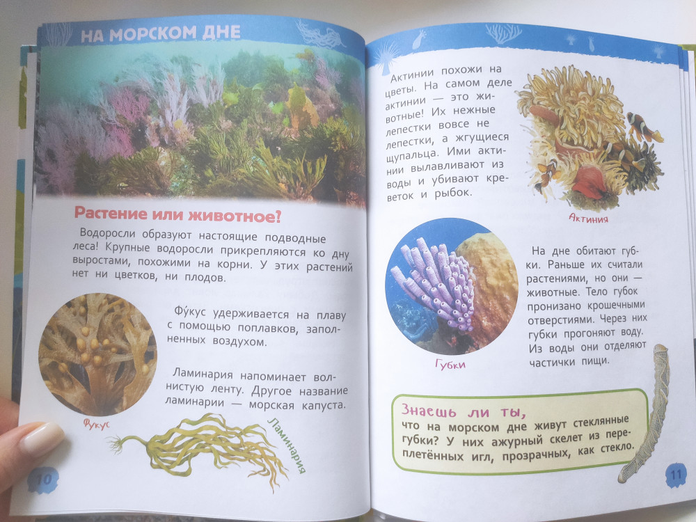 Хорошая книжка. Переплёт твёрдый, страницы прочные. Иллюстрации реалистичны, и дают верное представление о жителях подводного мира. Иллюстрации сопровождаются соответствующим текстом, что расширяет представления детей об окружающем мире. Но, конечно, книжка для детей постарше (примерно 4 и более лет).