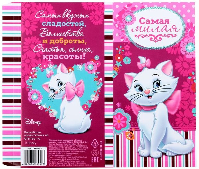 Disney Обертка для шоколада «Самая милая» (18,2 × 15,5 см)В данный момент этот товар отсутствует в продаже. Возможно, у нас найдется аналогичный или похожий товар здесь. Серия: Коты аристократы Все любят шоколад, особенно дети! А плитка, обёрнутая в упаковку с любимыми героями Disney — радость вдвойне. Такая красочная этикетка будет прекрасным дополнением к сладости. Изделие можно использовать вместо обычной упаковки или обернуть плитку сверху, закрепив клеем. Оно рассчитано на шоколад стандартного размера. |