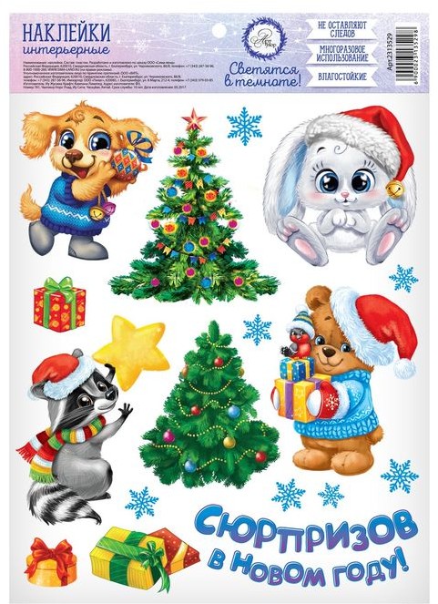 Арт Узор Наклейки «Сюрпризов в Новом Году»В данный момент этот товар отсутствует в продаже. Возможно, у нас найдется аналогичный или похожий товар здесь. Наклейки — простое, но креативное решение для обновления интерьера. Декор преобразит интерьер, наполнив его праздничным настроением. Наклейки отлично ложатся на любую поверхность: стекло, бумагу, пластик, дерево, обои, металл. Не оставляют следов при снятии. Наклейки светятся в темноте. |