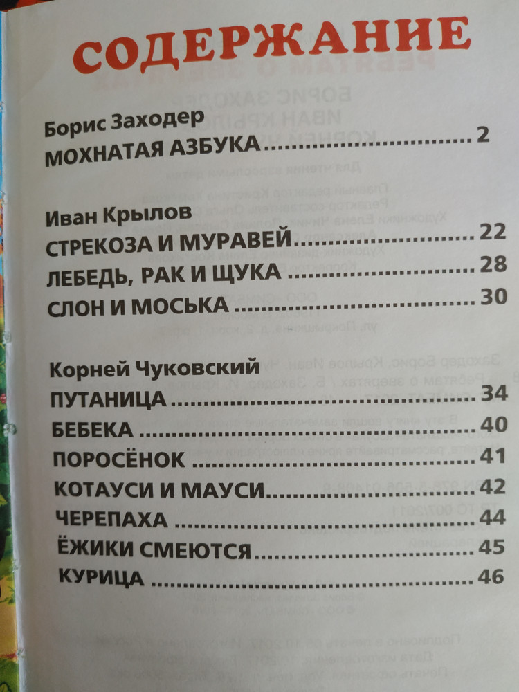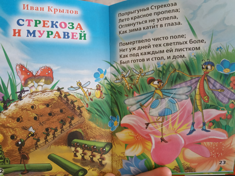 Сыну 3,4 года. Больше всего понравились знаменитые басни И.Крылова "Стрекоза и муравей", "Слон и моська". Отличная книга с яркими иллюстрациями. Фото содержания книги прилагаю.