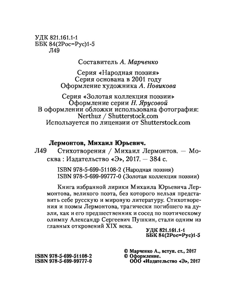 СтихотворенияВ данный момент этот товар отсутствует в продаже. Возможно, у нас найдется аналогичный или похожий товар здесь. Серия: Золотая коллекция поэзии Книга избранной лирики Михаила Юрьевича Лермонтова, великого поэта, без которого нельзя представить себе русскую и мировую литературу. Стихотворения и поэмы Лермонтова, трагически погибшего на дуэли, как и его предшественник и сосед по поэтическому Олимпу - Александр Сергеевич Пушкин, стали одним из главных откровений XIX века. |