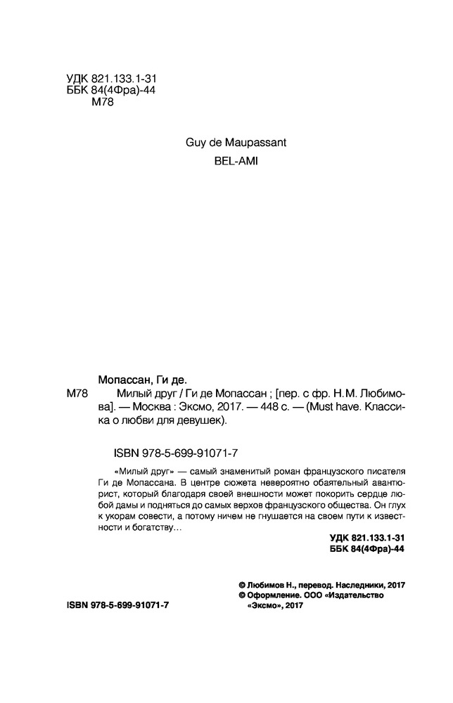 Милый другВ данный момент этот товар отсутствует в продаже. Возможно, у нас найдется аналогичный или похожий товар здесь. Серия: Must have. Классика о любви для девушек «Милый друг» - самый знаменитый роман французского писателя Ги де Мопассана. В центре сюжета невероятно обаятельный авантюрист, который благодаря своей внешности может покорить сердце любой дамы и подняться до самых верхов французского общества. Он глух к укорам совести, а потому ничем не гнушается на своем пути к известности и богатству...  |