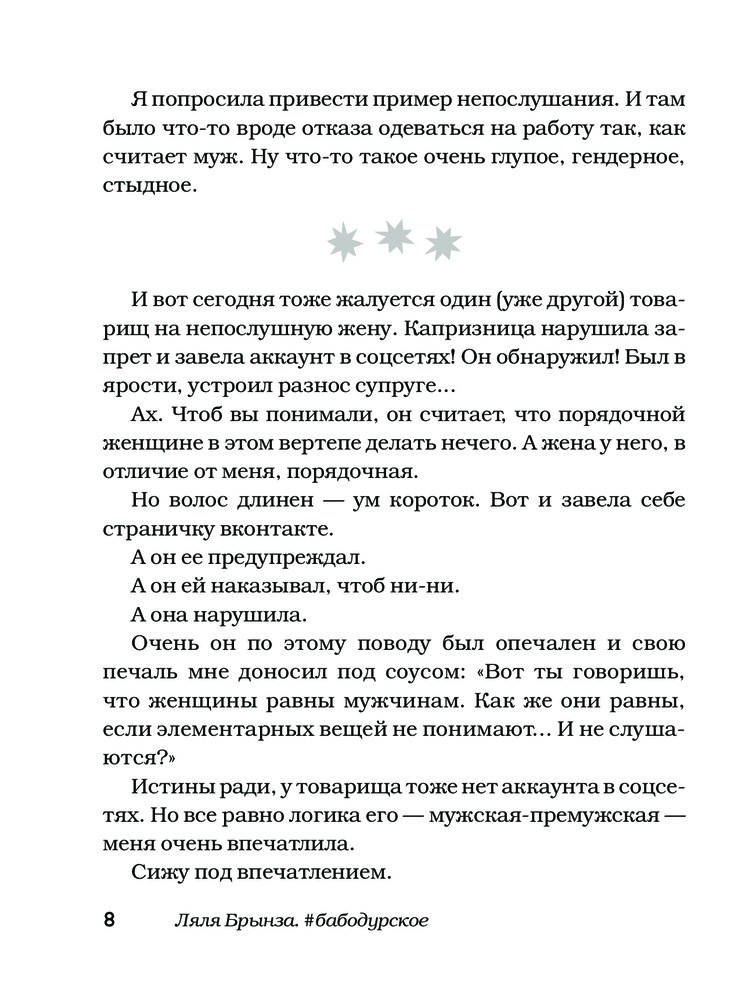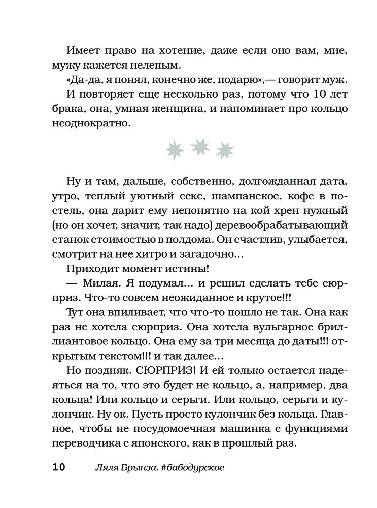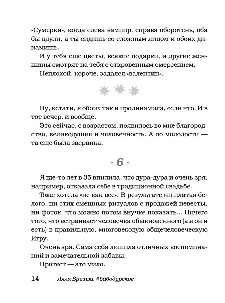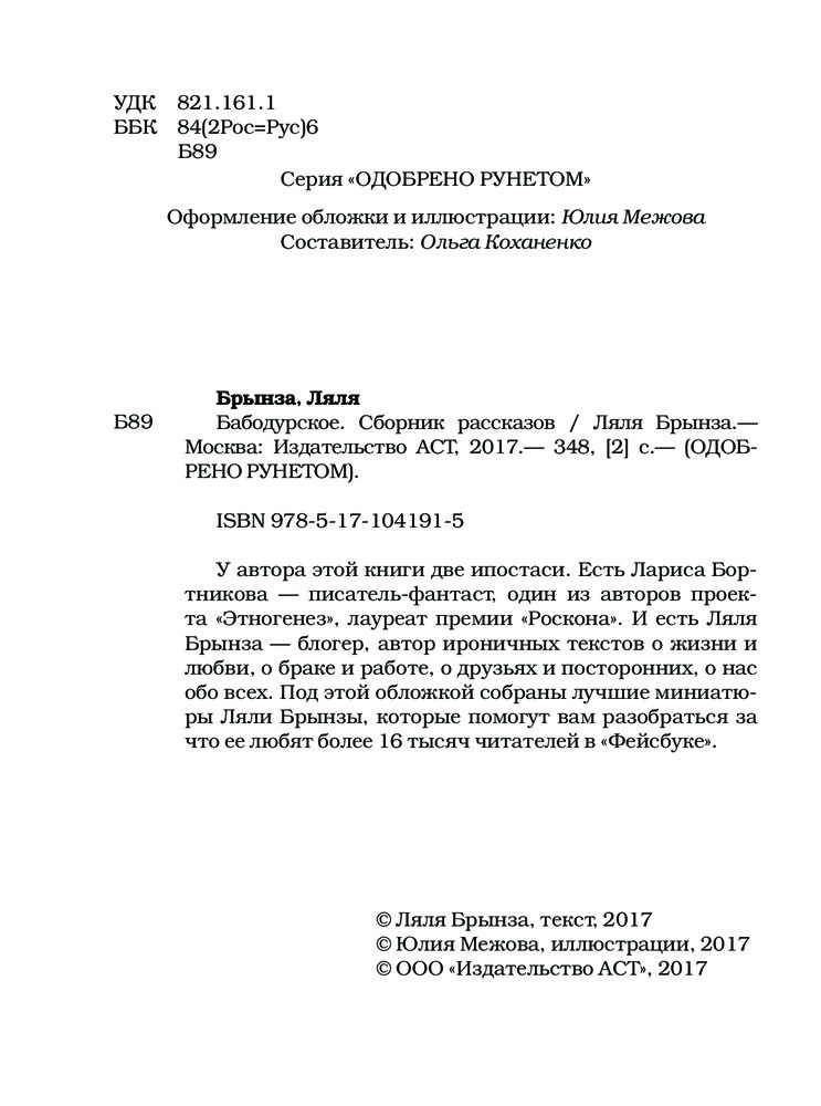 #бабодурскоеВ данный момент этот товар отсутствует в продаже. Возможно, у нас найдется аналогичный или похожий товар здесь. У автора этой книги две ипостаси. Есть Лариса Бортникова — писатель-фантаст, один из авторов проекта «Этногенез», лауреат премии «Роскона». И есть Ляля Брынза — блогер, автор ироничных текстов о жизни и любви, о браке и работе, о друзьях и посторонних, о нас обо всех. Под этой обложкой собраны лучшие миниатюры Ляли Брынзы, которые помогут вам разобраться за что ее любят более 16 тысяч читателей в «Фейсбуке». |