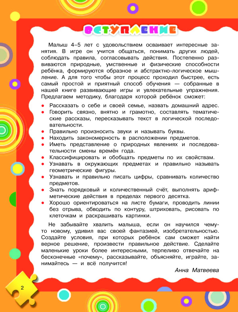 «Первый учебник малыша с наклейками. Полный годовой курс занятий для детей 4–5 лет» — развивающие пособие для обучения малышей в возрасте 4-5 лет, созданное по авторской методике А.С. Матвеевой. Выполняя увлекательные задания, ребёнок значительно расширит кругозор и разовьёт интеллект, узнает много новых слов, выучит алфавит, научится правильно произносить звуки, познакомится с понятиями формы, цвета, размера и количества предметов, научится писать цифры и считать до 10, рассказывать, объяснять, читать стихи наизусть. 64 наклейки превратят обучающие занятия в увлекательную игру. |