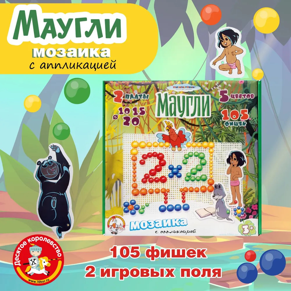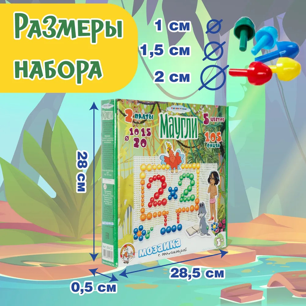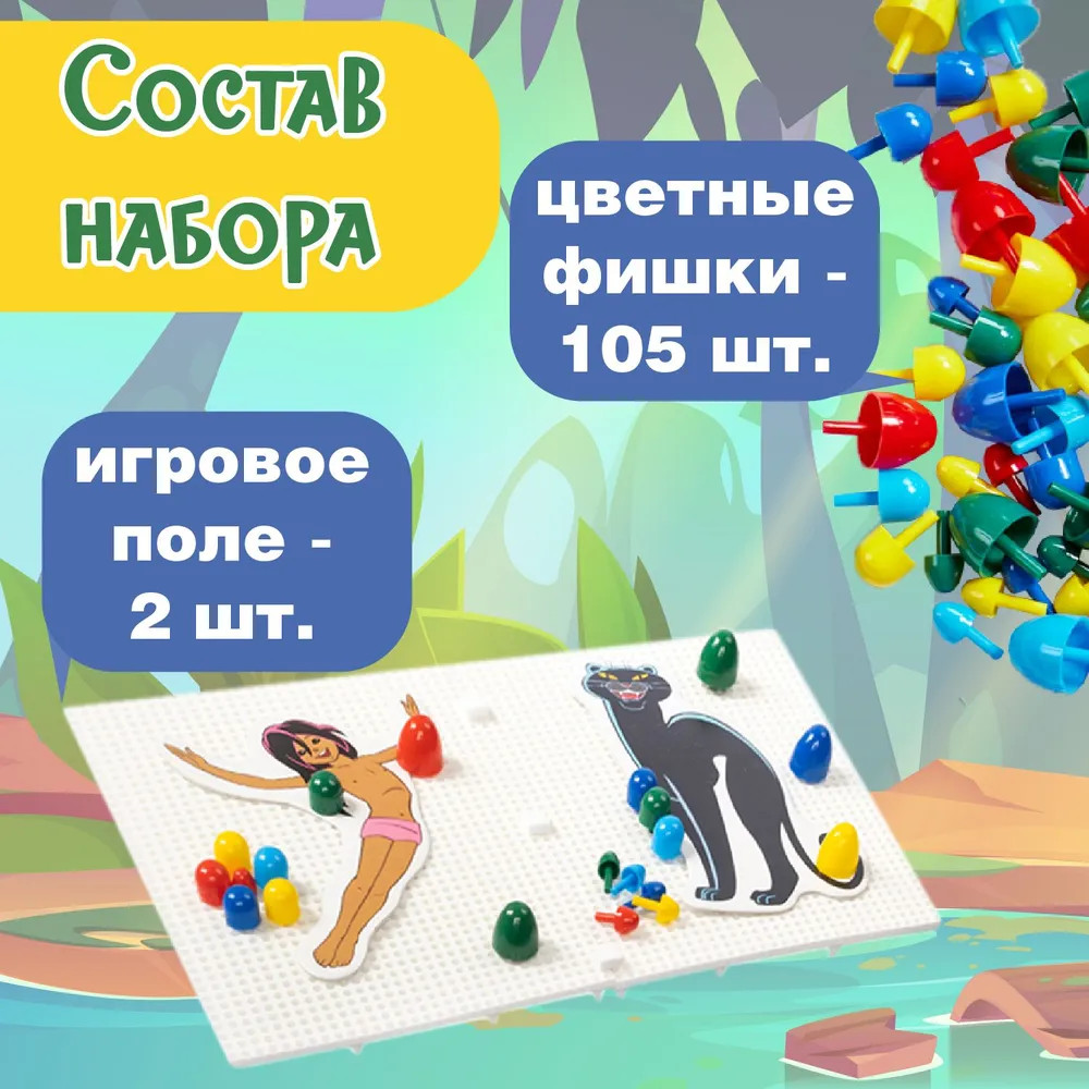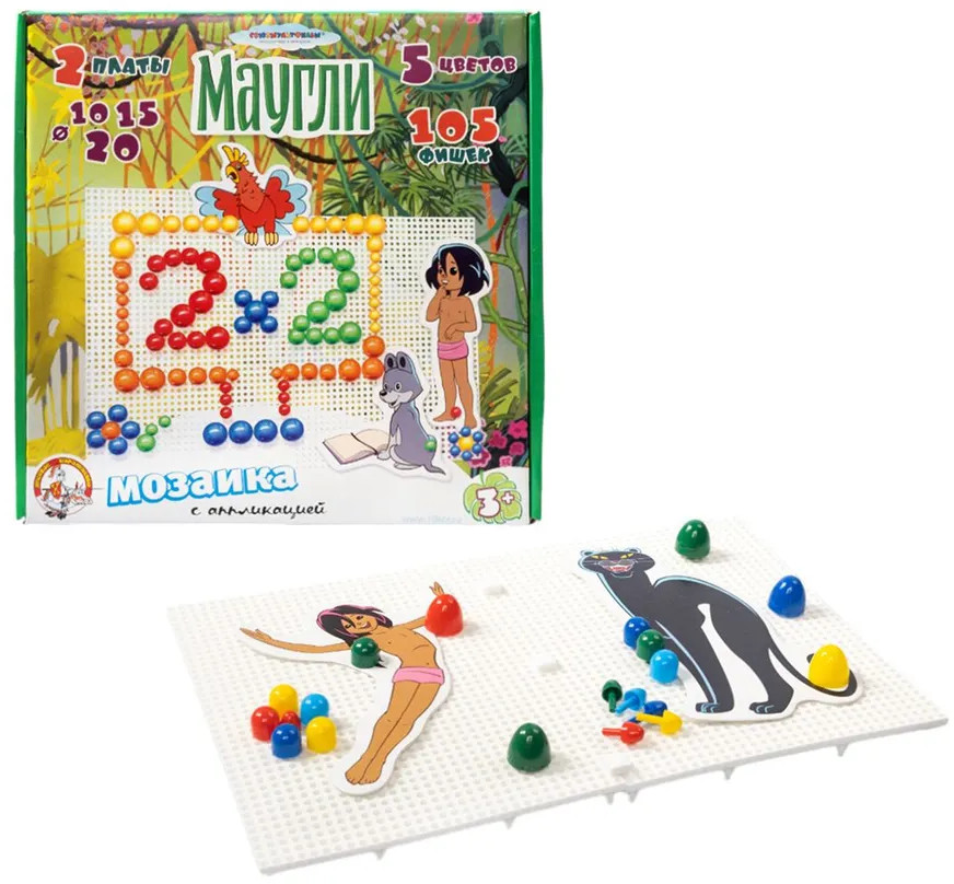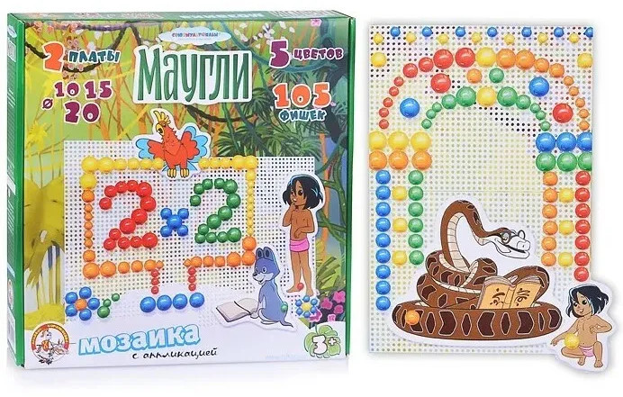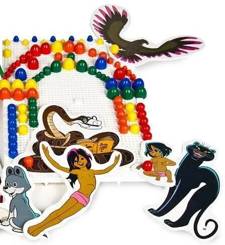 Набор «Маугли» содержит 2 платы для создания на них мозаики из фишек. Круглые фишки набора бывают разных диаметров, чтобы у ребенка была возможность собирать более сложные и интересные картинки с линиями разной толщины. Также в комплекте находятся аппликации с изображениями героев мультфильма Маугли: сам главный герой, показанный в разных возрастах и животные из джунглей. Аппликациями можно украсить свою мозаику, сделав ее еще более оригинальной. |