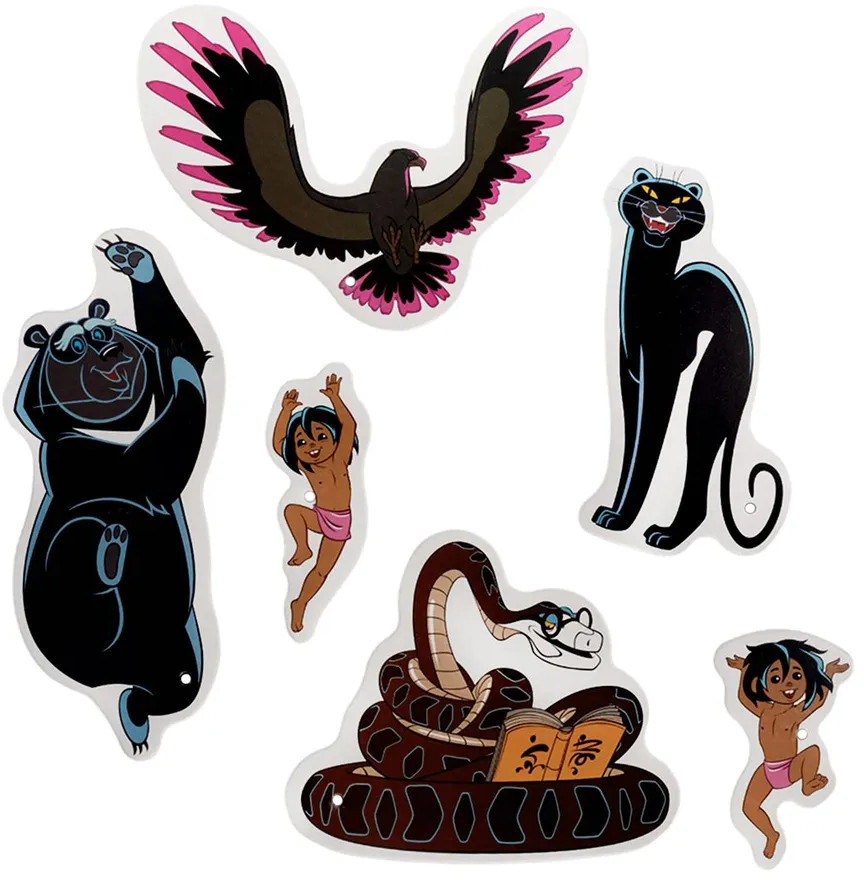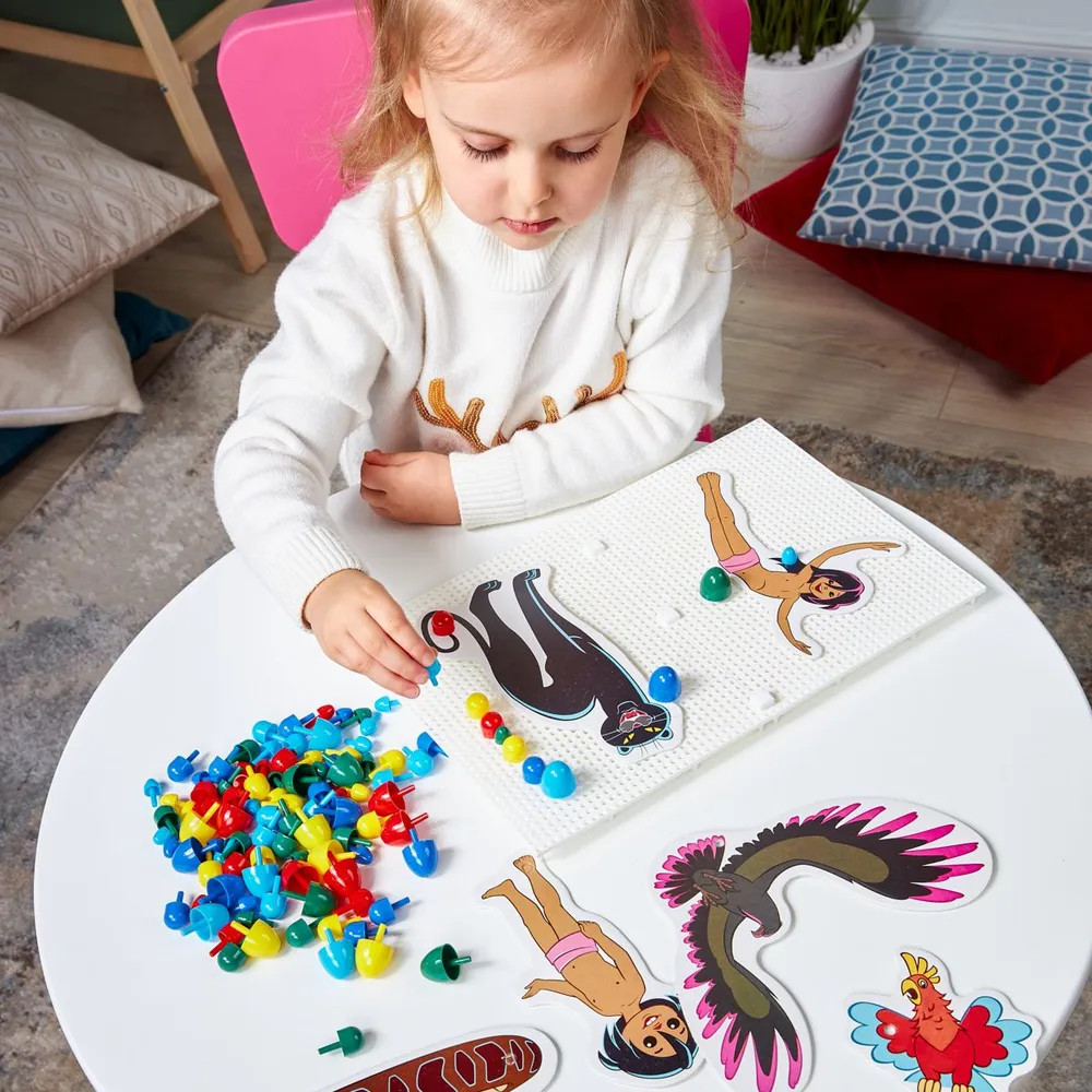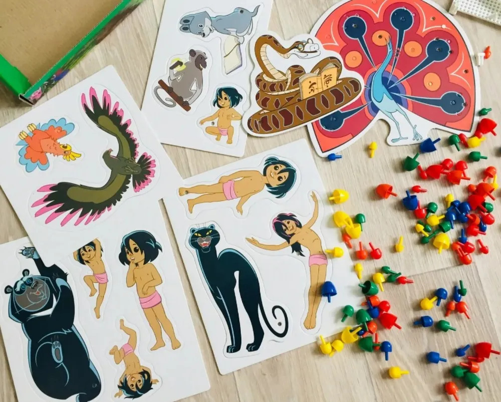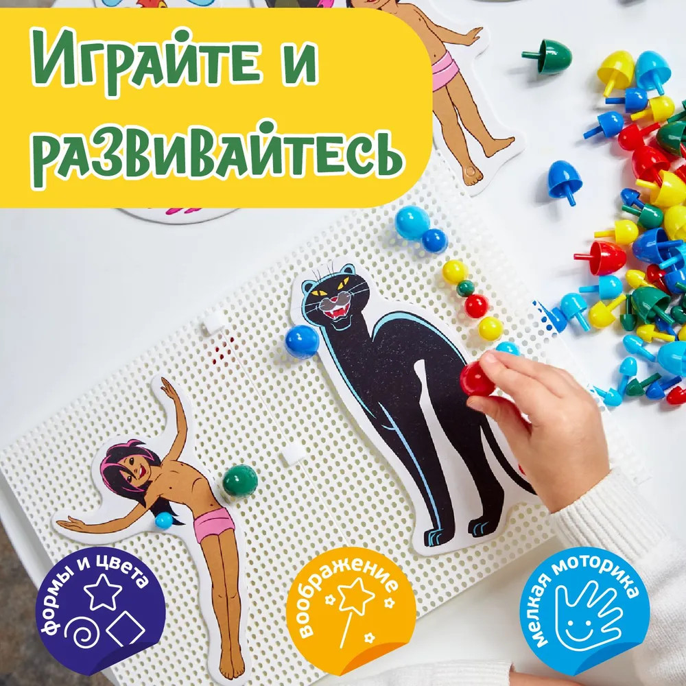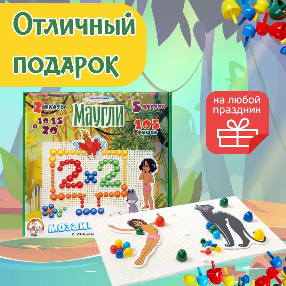 Набор «Маугли» содержит 2 платы для создания на них мозаики из фишек. Круглые фишки набора бывают разных диаметров, чтобы у ребенка была возможность собирать более сложные и интересные картинки с линиями разной толщины. Также в комплекте находятся аппликации с изображениями героев мультфильма Маугли: сам главный герой, показанный в разных возрастах и животные из джунглей. Аппликациями можно украсить свою мозаику, сделав ее еще более оригинальной. |