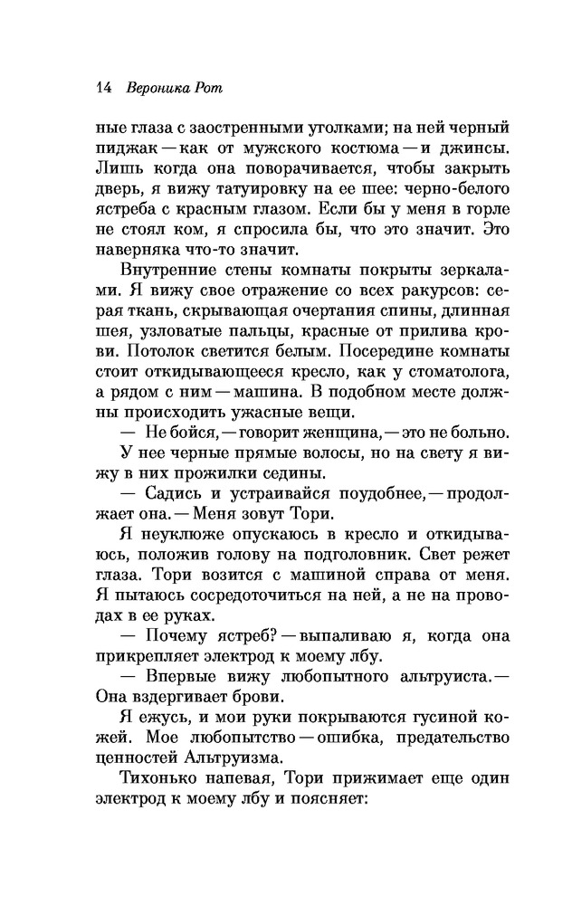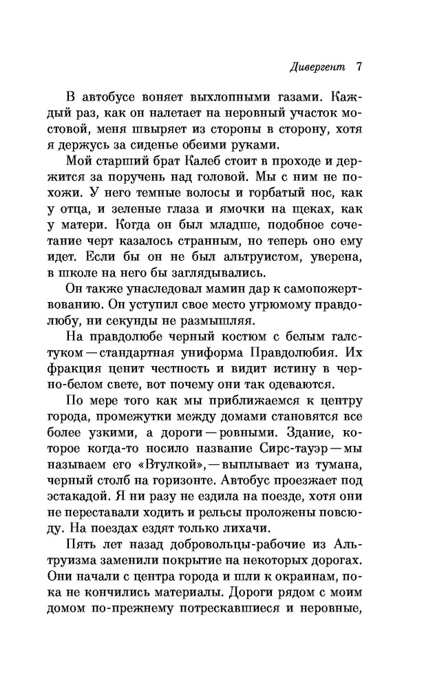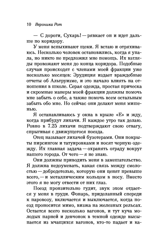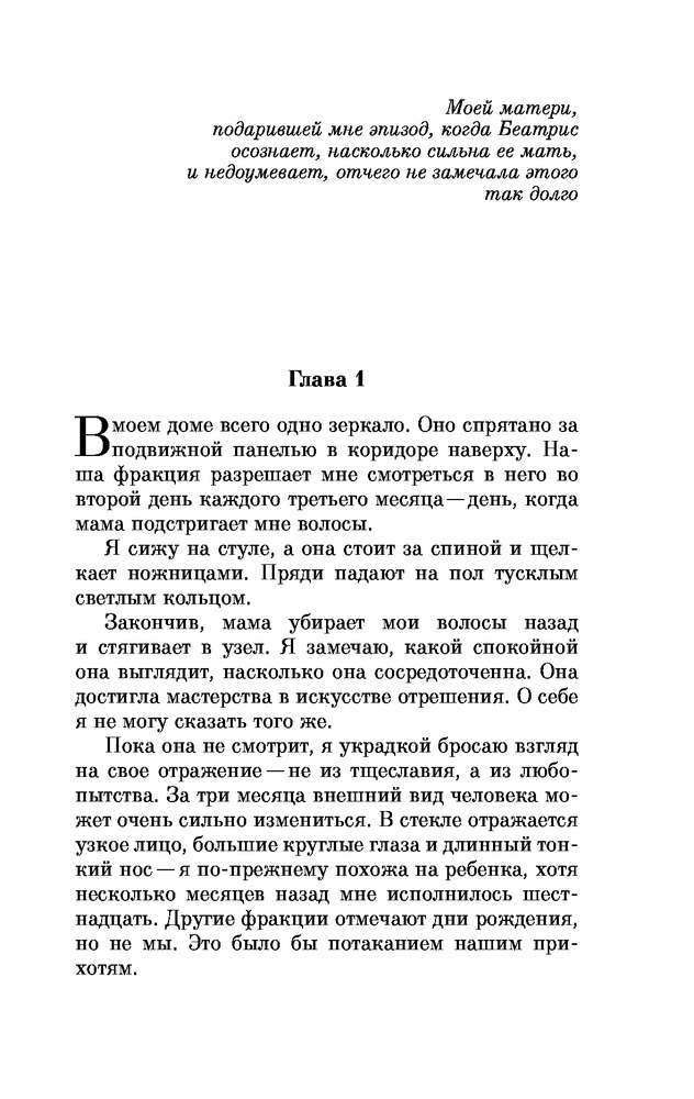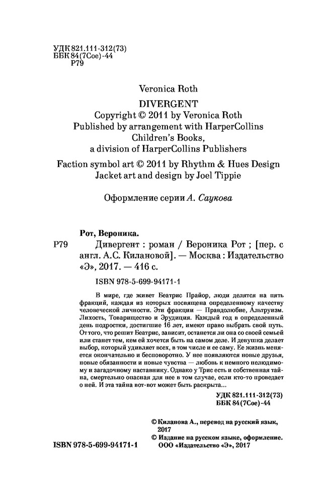 ДивергентВ данный момент этот товар отсутствует в продаже. Возможно, у нас найдется аналогичный или похожий товар здесь. Серия: Pocket Book (обложка) В мире, где живет Беатрис Прайор, люди делятся на пять фракций, каждая из которых посвящена определенному качеству человеческой личности. Эти фракции — Правдолюбие, Альтруизм. Лихость, Товарищество и Эрудиция. Каждый год в определенный день подростки, достигшие 16 лет, имеют право выбрать свой путь. От того, что решит Беатрис, зависит, останется ли она со своей семьей или станет тем, кем ей хочется быть на самом деле. И девушка делает выбор, который удивляет всех, в том числе и ее саму. Ее жизнь меняется окончательно и бесповоротно. У нее появляются новые друзья, новые обязанности и новые чувства — любовь к немного нелюдимому и загадочному наставнику. Однако у Трис есть и собственная тайна, смертельно опасная для нее в том случае, если кто-то проведает о ней. И эта тайна вот-вот может быть раскрыта... |