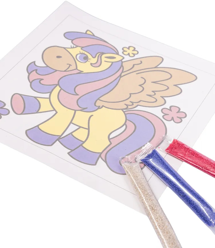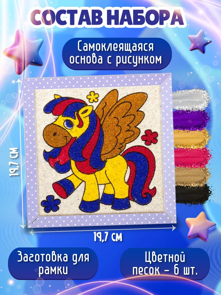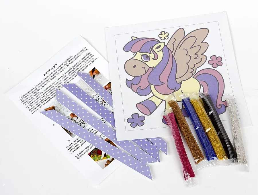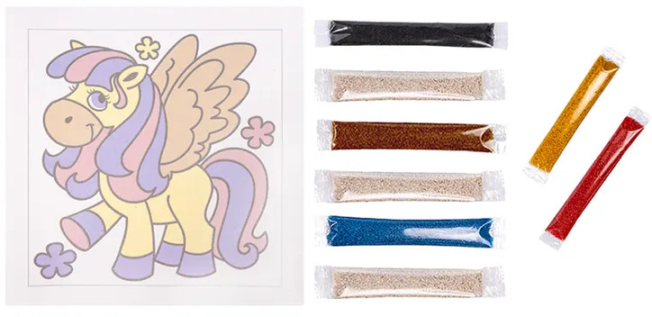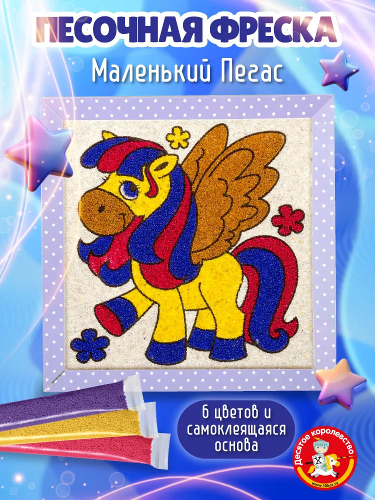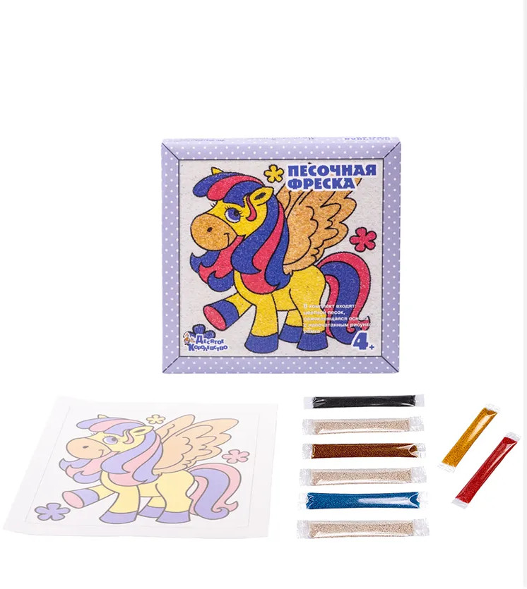 В данный момент этот товар отсутствует в продаже. Возможно, у нас найдется аналогичный или похожий товар здесь. Серия: Песочная фреска Песочная фреска «Маленький пегас» станет прекрасным подарком для тех деток, кто увлекается творчеством. Набор включает в себя песок 6 различных цветов, рамку и специальную подложку с самоклеящейся основой.