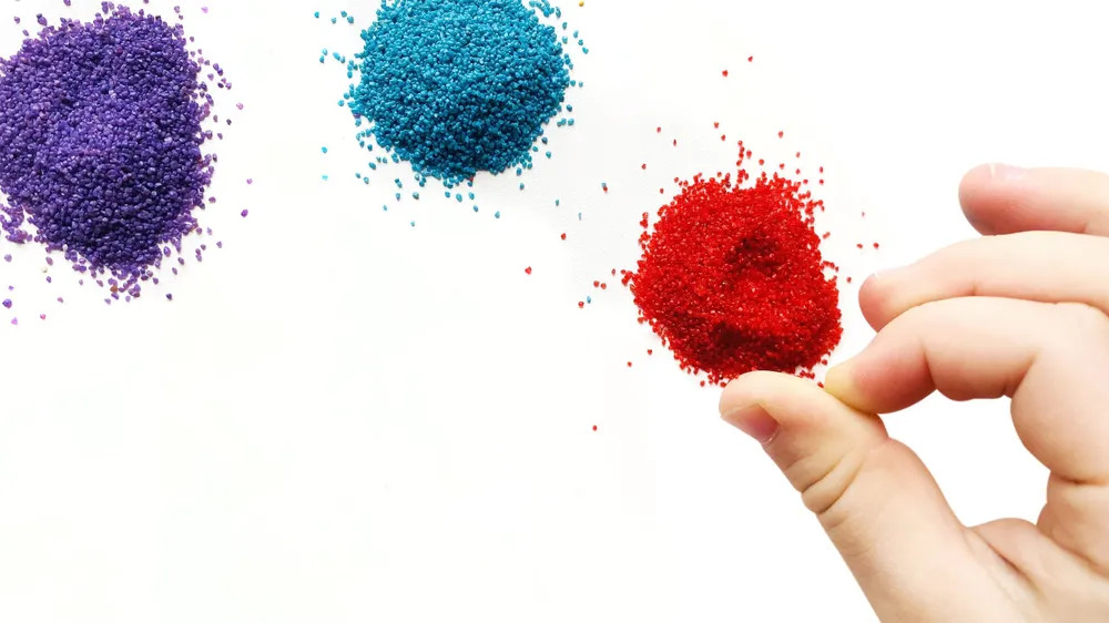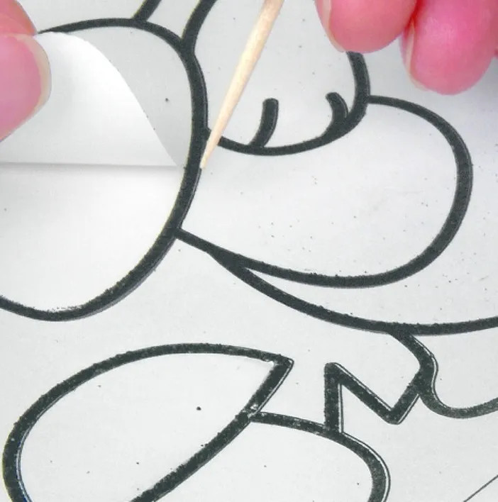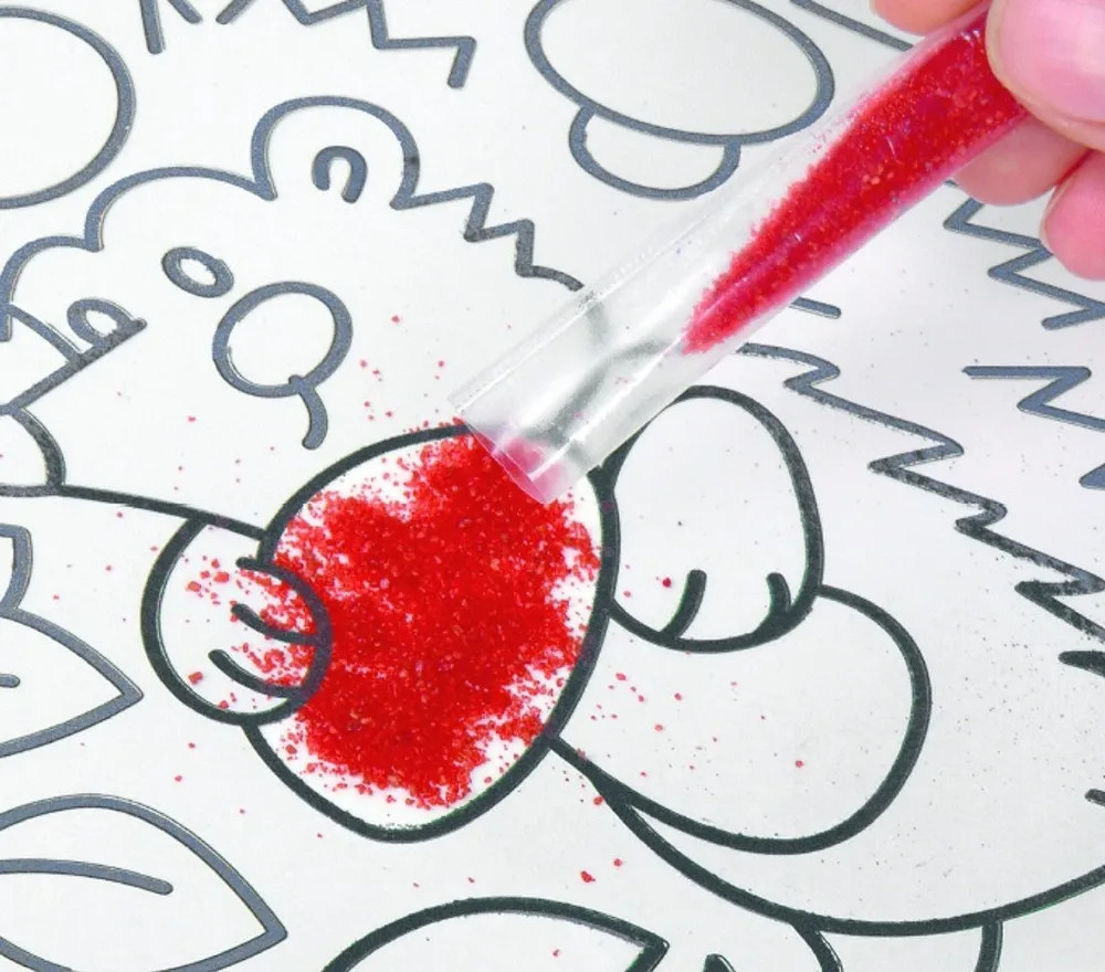 Технология изготовления рамки очень проста: необходимо снять с подложки защитный слой, а затем, не выходя за границы рисунка, раскрасить изображение при помощи цветного песка. Готовую картину можно поместить в специальную рамку и украсить ею детскую комнату.