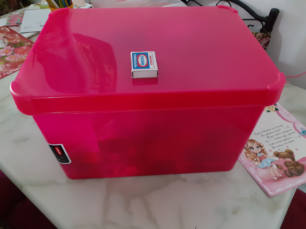Уже год как купила этот ящик, качество нормальное, мы пользуемся очень аккуратно просто. Пластик не плотный, тонкий. Положили все мелочи для волос, чтоб всё лежало в одном месте и детей с детства приучать таким образом к порядку - каждая вещь должна быть на своём месте!))