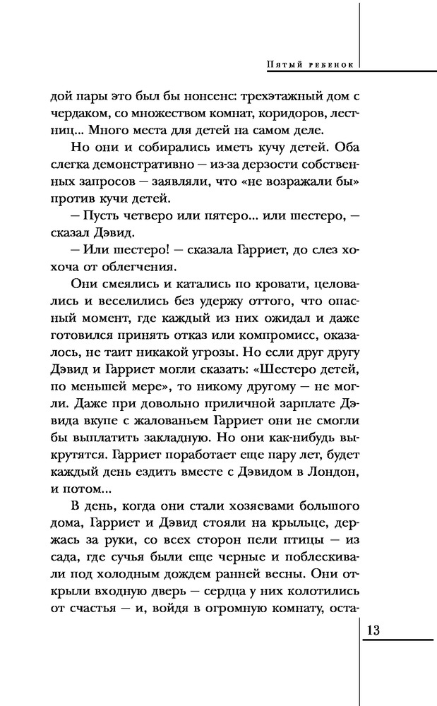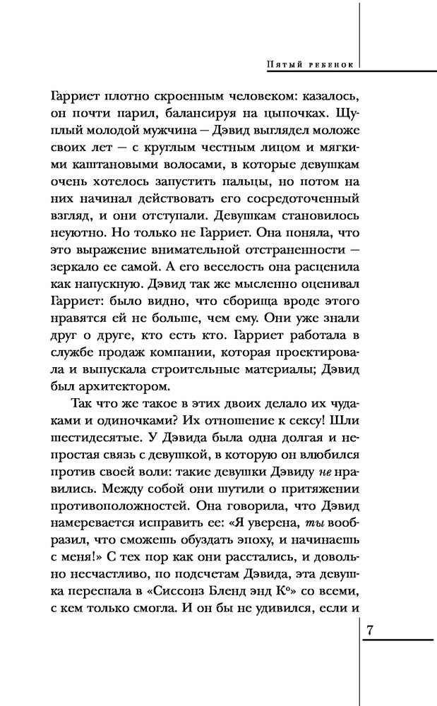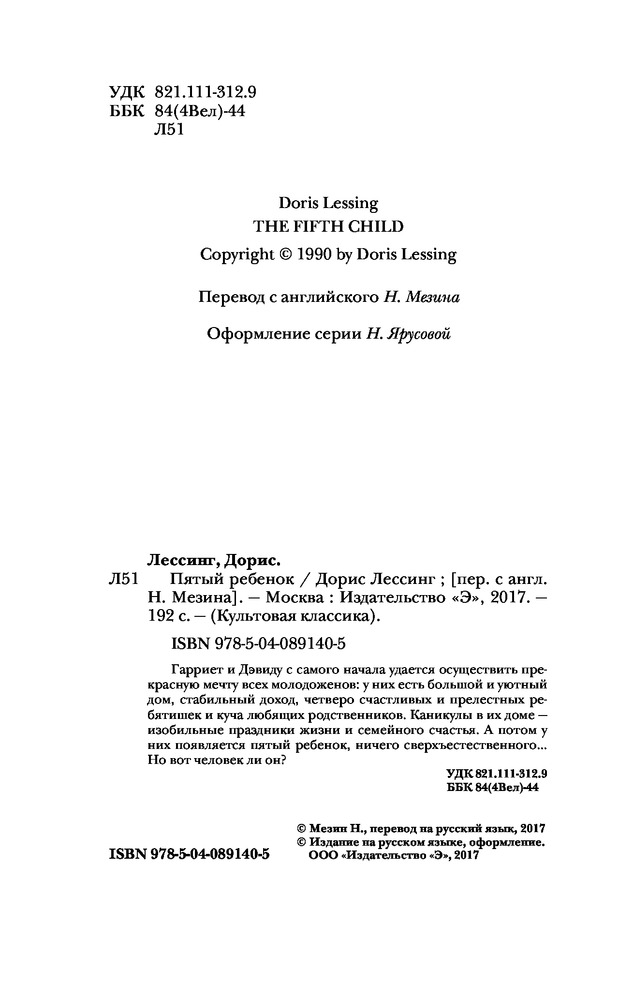 Пятый ребенокВ данный момент этот товар отсутствует в продаже. Возможно, у нас найдется аналогичный или похожий товар здесь. Серия: Культовая классика Гарриет и Дэвиду с самого начала удается осуществить прекрасную мечту всех молодоженов: у них есть большой и уютный дом, стабильный доход, четверо счастливых и прелестных ребятишек и куча любящих родственников. Каникулы в их доме — изобильные праздники жизни и семейного счастья. А потом у них появляется пятый ребенок, ничего сверхъестественного... Но вот человек ли он? |