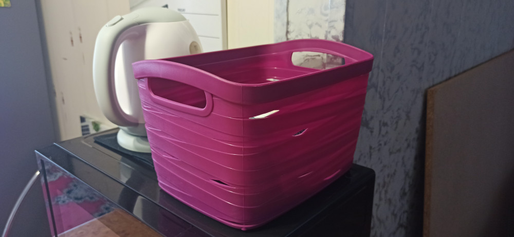 Корзинка хорошая. Никакого лишнего запаха. Такая же яркая как на фото, но один недостаток. В длину она меньше, всего 22 см, а не 25.5 как заявлено. Белая такая как и заявлено.