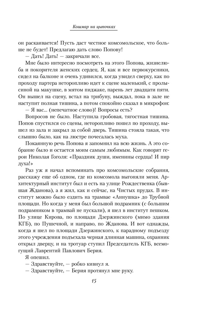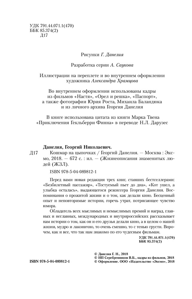 Кошмар на цыпочкахВ данный момент этот товар отсутствует в продаже. Возможно, у нас найдется аналогичный или похожий товар здесь. Серия: Жизнеописания знаменитых людей Перед вами новая редакция трех книг, ставших бестселлерами: «Безбилетный пассажир», «Тостуемый пьет до дна», «Кот ушел, а улыбка осталась», выдающегося режиссера Георгия Данелия. Воспоминания о прожитой жизни и о том, как делали кино. Бесценный опыт и неповторимые истории, горечь утрат, потрясающее чувство юмора. |