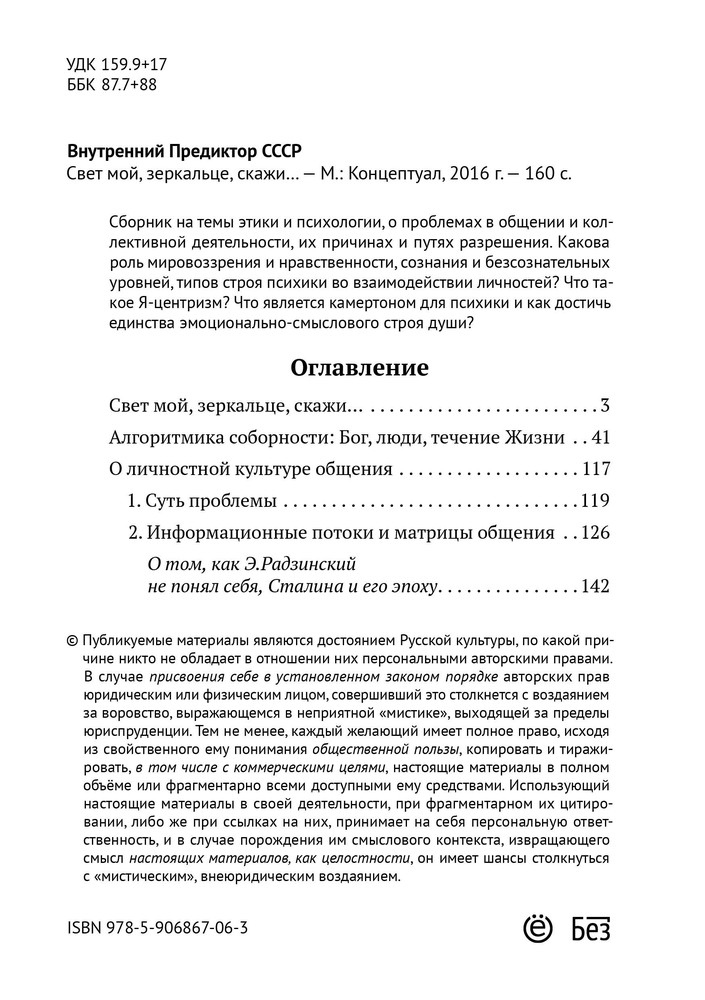 Свет мой, зеркальце, скажи. Об алгоритмике мышления и психической деятельностиВ данный момент этот товар отсутствует в продаже. Возможно, у нас найдется аналогичный или похожий товар здесь. Сборник на темы этики и психологии, о проблемах в общении и коллективной деятельности, их причинах и путях разрешения. Какова роль мировоззрения и нравственности, сознания и безсознательных уровней, типов строя психики во взаимодействии личностей? Что такое Я-центризм? Что является камертоном для психики и как достичь единства эмоционально-смыслового строя души? |