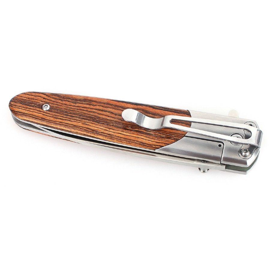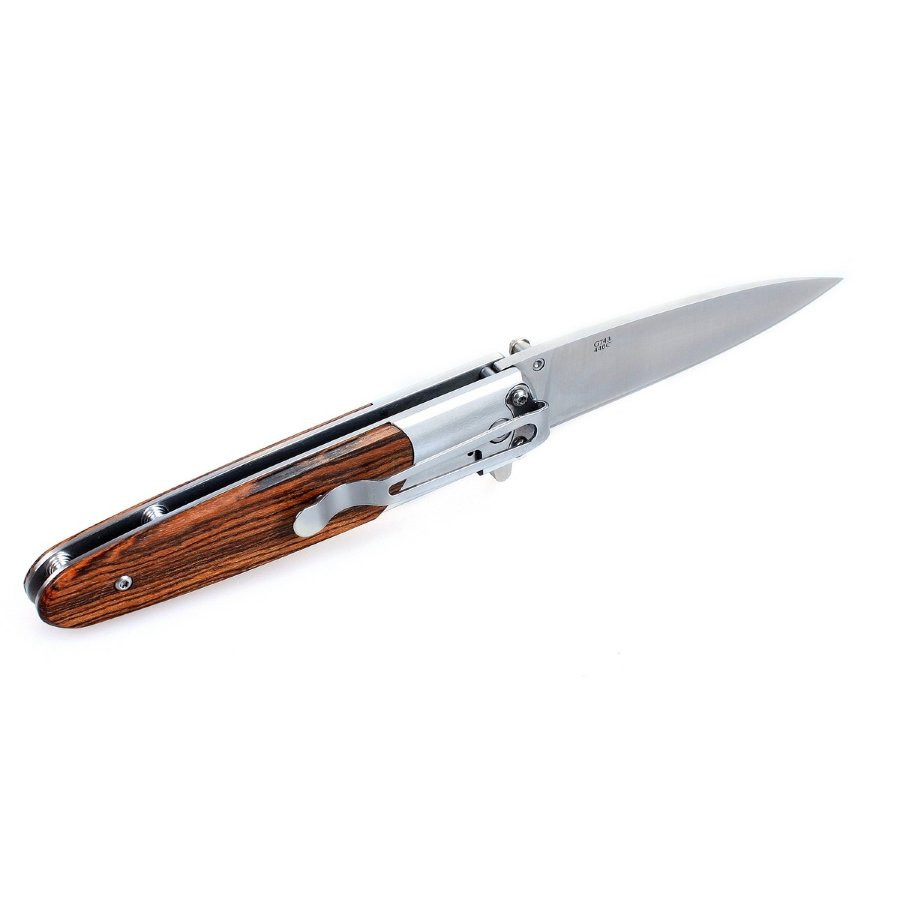 Форма рукоятки в модели G743-1 очень лаконична. Снизу и сверху она ровная, а внешний торец аккуратно закруглен. Ближе к клинку часть рукоятки сделана из стали и отшлифована тем же методом, что и клинок. К этой металлической части крепится и клипса, служащая дополнительной мерой фиксации ножа, когда он должен оставаться в зоне доступности во время поездок владельца ножа на природу.